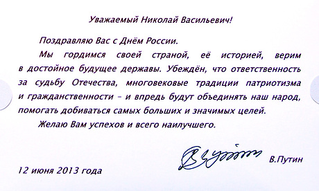 В адрес Губернатора Брянской области Николая Денина пришло поздравление с Днем России от Президента Российской Федерации Владимира Путина: