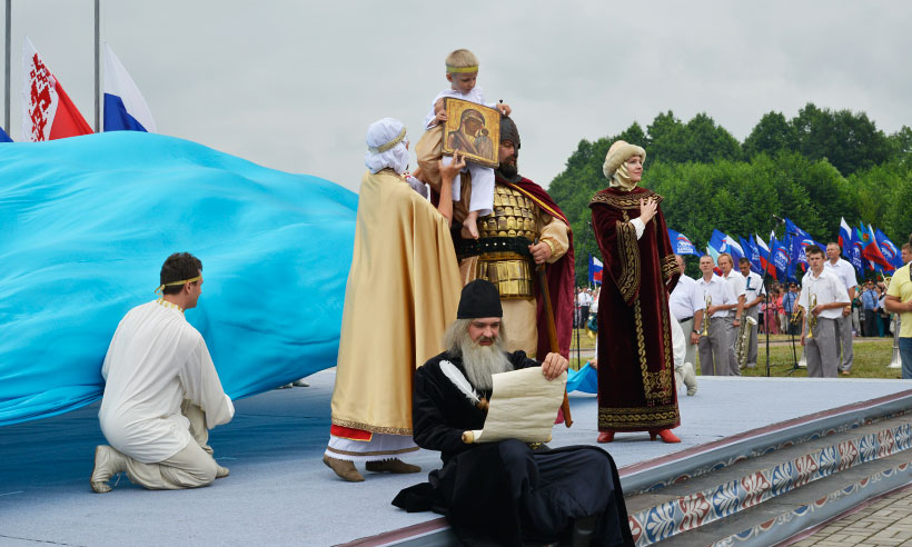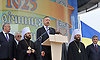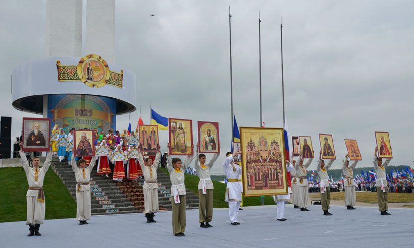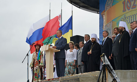 «Нас связывают мощные духовные скрепы. Мы вместе пресекаем попытки разорвать вековое славянское единство, которое неотделимо от Русской православной церкви. В конце лета 988 года князь Владимир собрал всех киевлян не берегу Днепра, и в его водах они были крещены. В той священной стихии обновился мир. Недаром же великий Пушкин считал, что история новейшая есть история христианства.