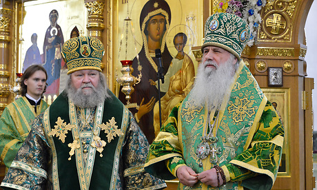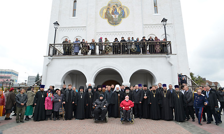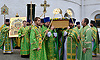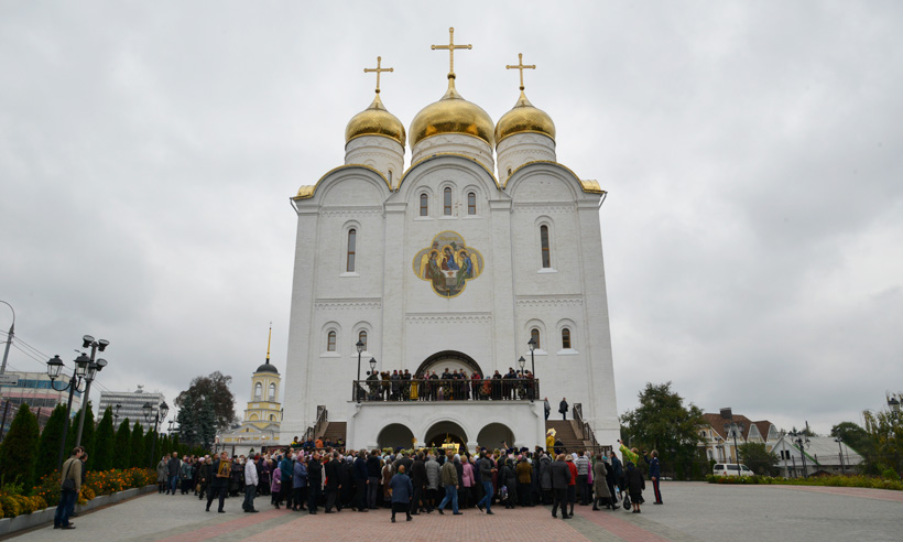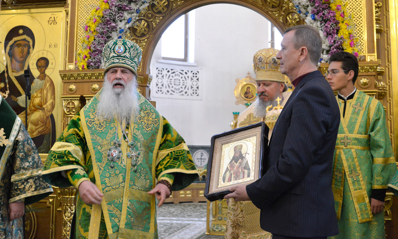 В центре собора на поклонение верующим была выставлена рака с мощами Преподобного Олега Брянского.