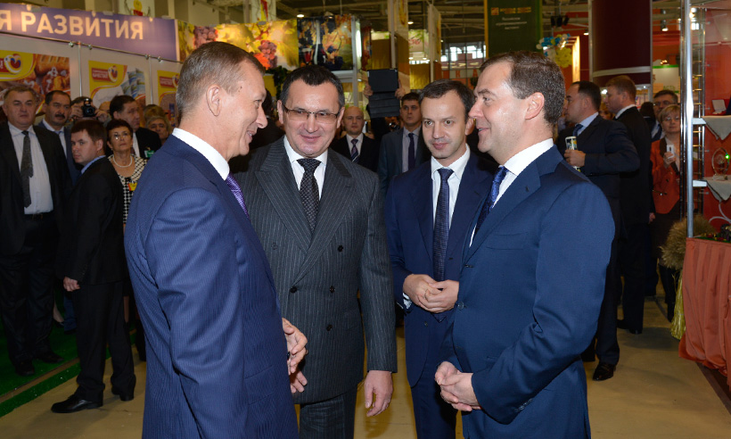Председатель Правительства РФ Дмитрий Медведев, заместитель премьера Аркадий Дворкович и глава Минсельхоза Николай Фёдоров надолго задержались у экспозиции Брянской области.