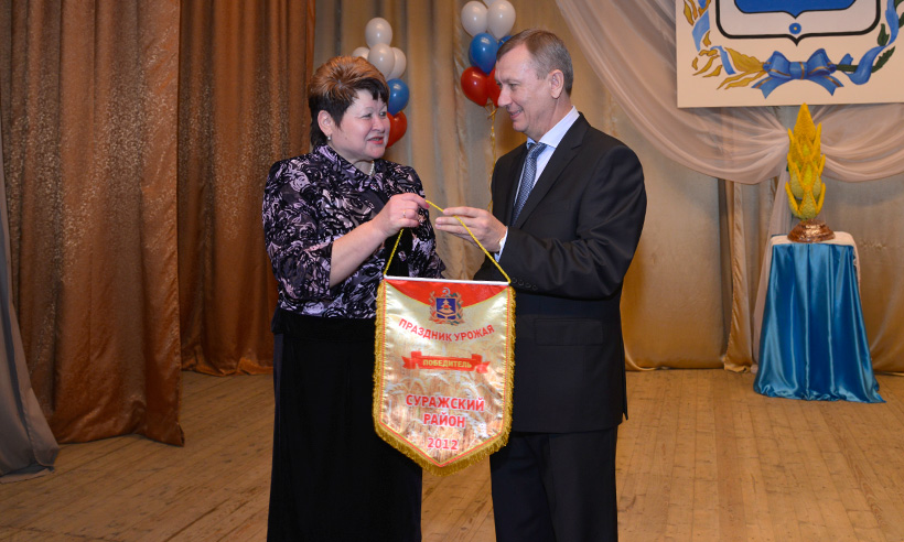 Праздник продолжился в районном Доме культуры. Протоиерей Димитрий благословил на дары урожая и добрые дела, вручив руководству района икону Божией Матери «Спорительница хлебов». После со сцены звучали слова благодарности в адрес тех, кто вложил свой труд в высокое звание «Суражский район — район-победитель!», кто живет и работает на благо процветания родной суражской земли.