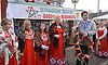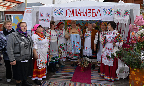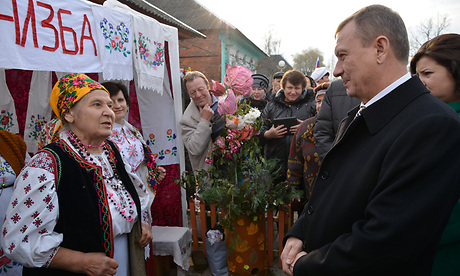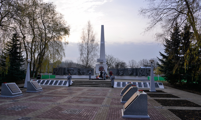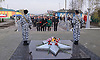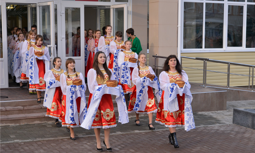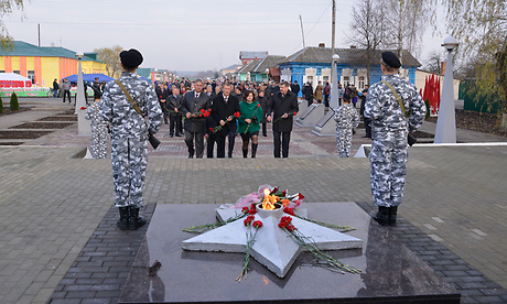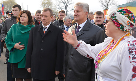 По русскому обычаю гостей встречали хлебом-солью. Потом гости во главе с Губернатором почтили память погибших в годы Великой Отечественной войны и возложили цветы к монументу павших за Родину воинов.