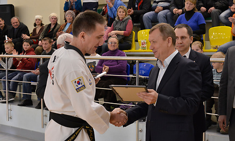 Николай Денин вручил благодарственные письма руководителю федерации тхеквондо области Владимиру Дзубану и инструктору ДЮСШ «Рекорд» Александру Лепешкину.