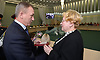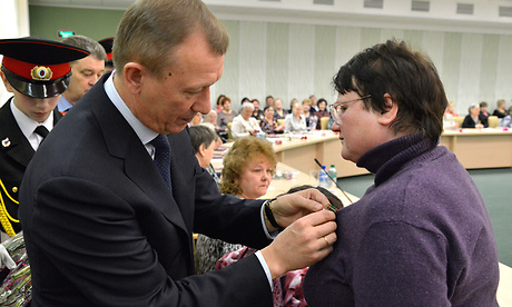 Губернатор Николай Денин, председатель Брянской области Владимир Гайдуков и главный федеральный инспектор по Брянской области Леонид Соломатин вручили женщинам памятные медали «70 лет освобождения Брянской области».