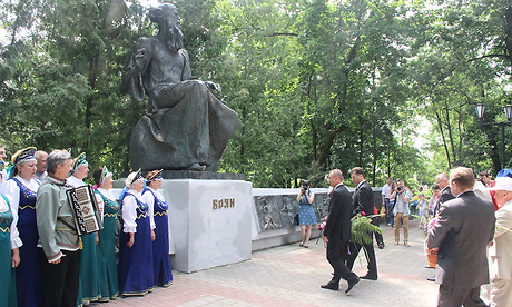 Далее участники праздничных мероприятий посетили парк культуры и отдыха, где возложили цветы к подножию памятника певцу земли русской Бояну.