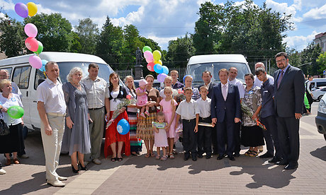 На Театральной площади заместитель Губернатора Андрей Пономарев, федеральный инспектор по Брянской области Михаил Калашников вручили ключи от микроавтобусов многодетным семьям, достойно воспитывающим семь и более детей. Такие микроавтобусы уже получили 14 многодетных семей Брянской области.