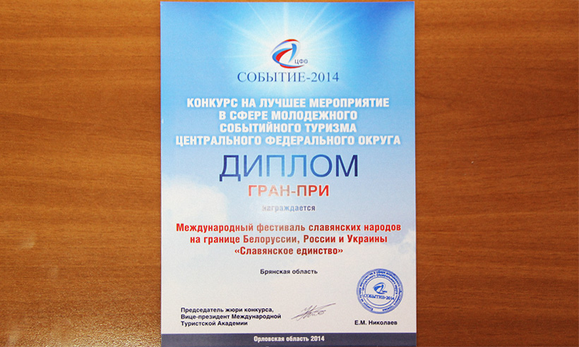 Решением конкурсной комиссии Международный фестиваль славянских народов на границе Белоруссии, России и Украины «Славянское единство» завоевал диплом Гран-при в конкурсе на лучшее мероприятие в сфере молодежного событийного туризма Центрального федерального округа.