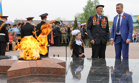 Почетное право зажечь Вечный огонь предоставили ветерану Великой Отечественной войны Ивану Иосифовичу Васильеву и лауреату городских, областных, всероссийских конкурсов и фестивалей Елизавете Бондаренко.