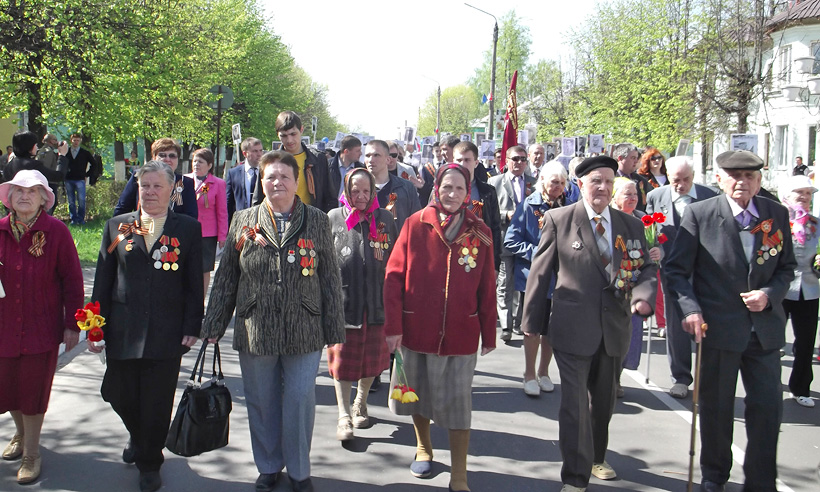 Под звуки духового оркестра старшеклассники развернули и понесли огромных размеров георгиевскую ленточку. В колонне, возглавляемой руководителями города, шли и ветераны. Седовласые, в орденах, еще бодро шагающие, они были для всех примером несгибаемой силы духа.