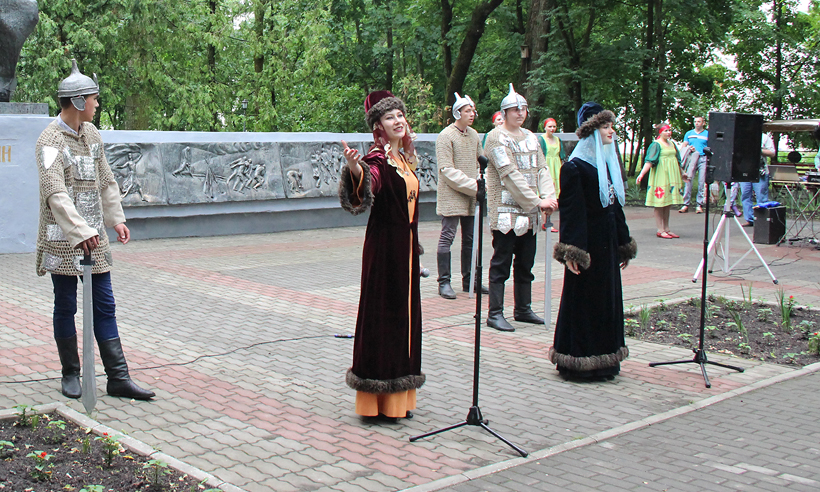 В парке трубчане и гости города стали свидетелями славянских боев древней эпохи — школьниками была поставлена военно-историческая реконструкция, в завершение которой к подножию бронзовой скульптуры Бояна по традиции были возложены цветы.