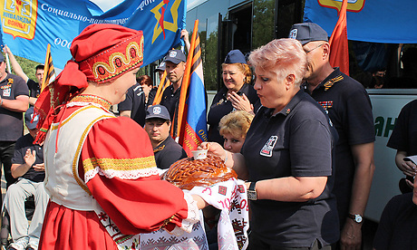 «Сильных духом» тепло встретили Герой России Александр Постоялко, руководители Карачевского района, представители ветеранских организаций. Девушки в русских костюмах преподнесли гостям хлеб-соль, исполнили для них песню.