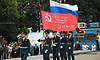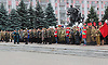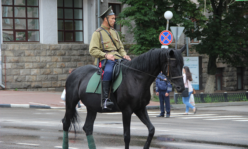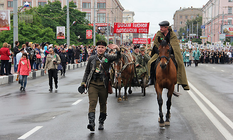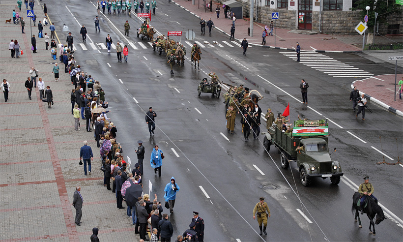 В костюмированной колонне ехали декорированные платформы и подводы, представляющие картины партизанской жизни, некоторые из подвод сопровождали всадники на конях. Здесь можно было увидеть красноармейских гармонистов, исполняющих военные песни, танкистов, женщин-пулеметчиц, машины военных лет.