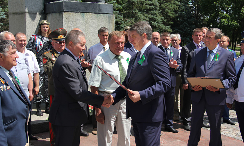 В торжественной обстановке глава региона Александр Богомаз, председатель областной Думы Владимир Попков и председатель областного комитета ветеранов войны и военной службы Василий Бударин вручили почетные Грамоты руководству Суземского района.
