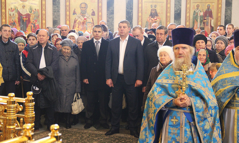 В завершение службы Александр Богомаз поздравил собравшихся сразу с двумя праздниками — церковным православным и светским — Днем народного единства.