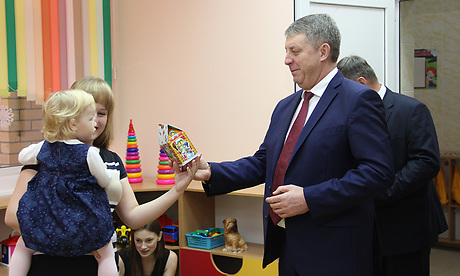 — Сегодня одна из задач — обеспечение детей от трех до семи лет местами в дошкольных учреждениях выполнена, — сказал губернатор. — У нас в регионе, в последнее время, как и по всей стране, положительная динамика по рождаемости. Пусть эта тенденция сохраняется, и чаще открывается не очередной торговый центр, а детское образовательное учреждение.