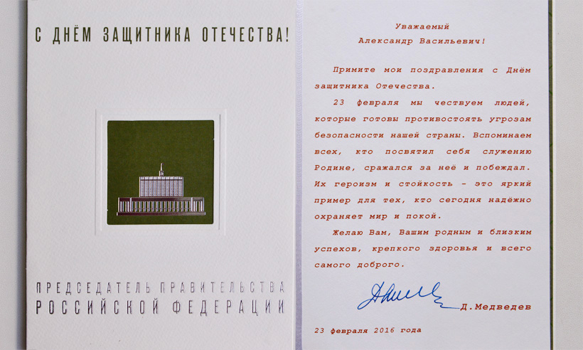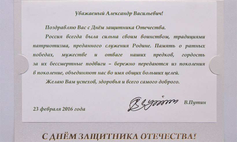 В адрес Губернатора Брянской области Александра Богомаза поступили поздравительные телеграммы с Днем защитника Отечества от Президента России Владимира Путина и Председателя Правительства России Дмитрия Медведева. В поздравлениях в частности говорится: