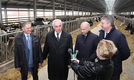Осмотрели гости и здание мясохладобойни ООО «Дружба», молочно-товарной фермы ООО «Нива», овоще- и картофелехранилища ООО «Дружба-2». Александр Богомаз рассказал Мурату Зязикову, что этот агрохолдинг, учрежденный Владимиром Жутенковым, сегодня является одним из лидеров сельхозпроизводства в регионе. Он входит в десятку крупнейших производителей свинины в стране, успешно выращивает картофель и овощи, производит высококачественное молоко. Всего — более 10 направлений деятельности. В качестве эксперимента в одном из подразделений холдинга содержатся не только привычные для Брянщины коровы, но и несколько экзотические животные, в частности — верблюды.