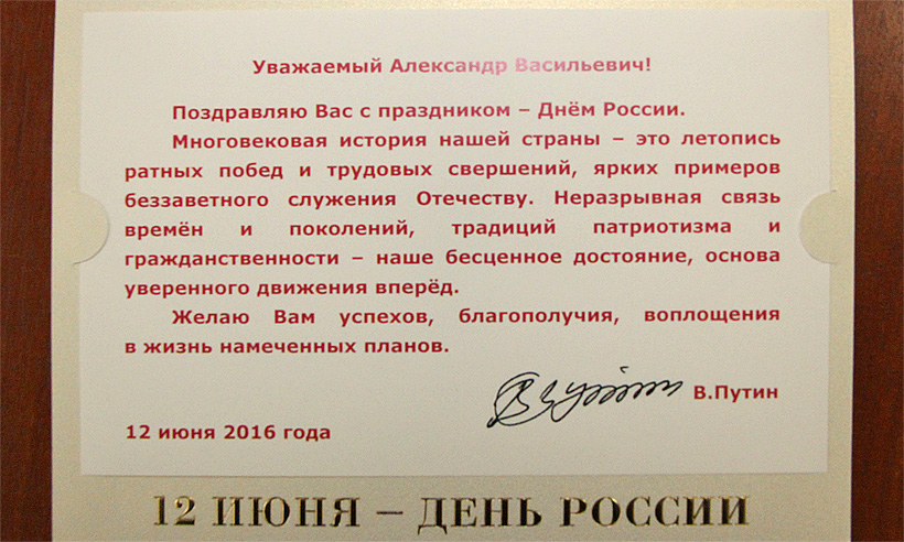 В поздравлении, в частности, говорится: «Уважаемый Александр Васильевич! Поздравляю Вас с праздником — Днём России. Многовековая история нашей страны — это летопись ратных побед и трудовых свершений, ярких примеров беззаветного служения Отечеству. Неразрывная связь времён и поколений, традиций патриотизма и гражданственности — наше бесценное достояние, основа уверенного движения вперёд.