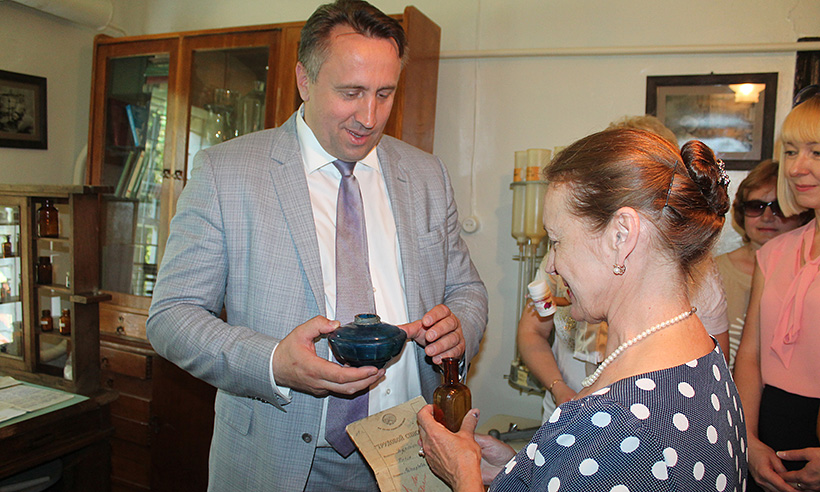 Аптека-музей разделена на две половины, где в одной по-прежнему будут отпускать готовые лекарственные средства, а в другой — проводить экскурсии. Первую экскурсию провела Вера Толочко, рассказавшая о том, как собирали экспонаты, которых и сейчас уже нигде не увидишь, а через несколько лет они станут настоящими музейными редкостями. К примеру, среди выставочного оборудования есть дистиллятор военного образца, который топится углем, порошковые дозаторы для порошков и жидкостей, мешалки для растворов и мазей, ступки, аптечная посуда, весы. Кроме того, в аптеке-музее имеется и старинная мебель, еще больше подчеркивающая ценность представленных музейных экспонатов.