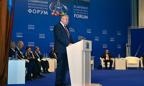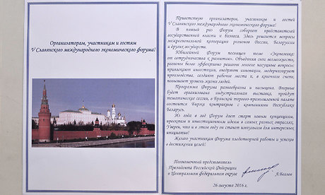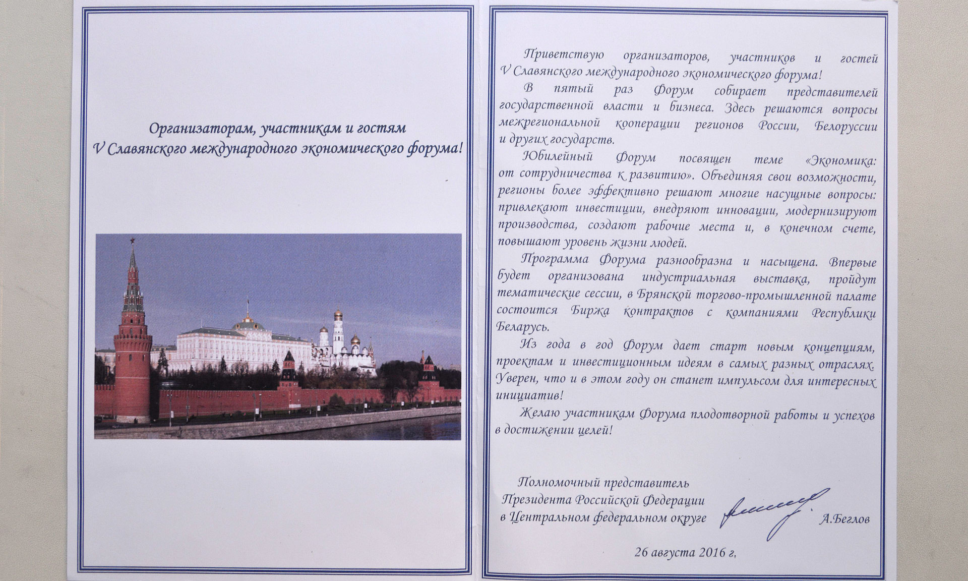 — Приветствую организаторов, участников и гостей V Славянского международного экономического форума. Пятый раз форум собирает представителей государственной власти и бизнеса. Здесь решаются вопросы межрегиональной кооперации регионов России, Белоруссии и других государств. Юбилейный форум посвящен теме «Экономика: от сотрудничества к развитию». Объединяя свои возможности, регионы эффективно решают многие насущные вопросы, привлекают инвестиции, внедряют инновации, модернизируют производство, создают рабочие места и в конечном счете повышают уровень жизни людей. Программа форума разнообразна и насыщенна. Из года в год форум дает старт новым концепциям, проектам, инвестиционным идеям в самых разных отраслях. Уверен, что и в этом году он станет импульсом для интересных инициатив. Желаю участникам форума плодотворной работы и успехов в достижении цели!