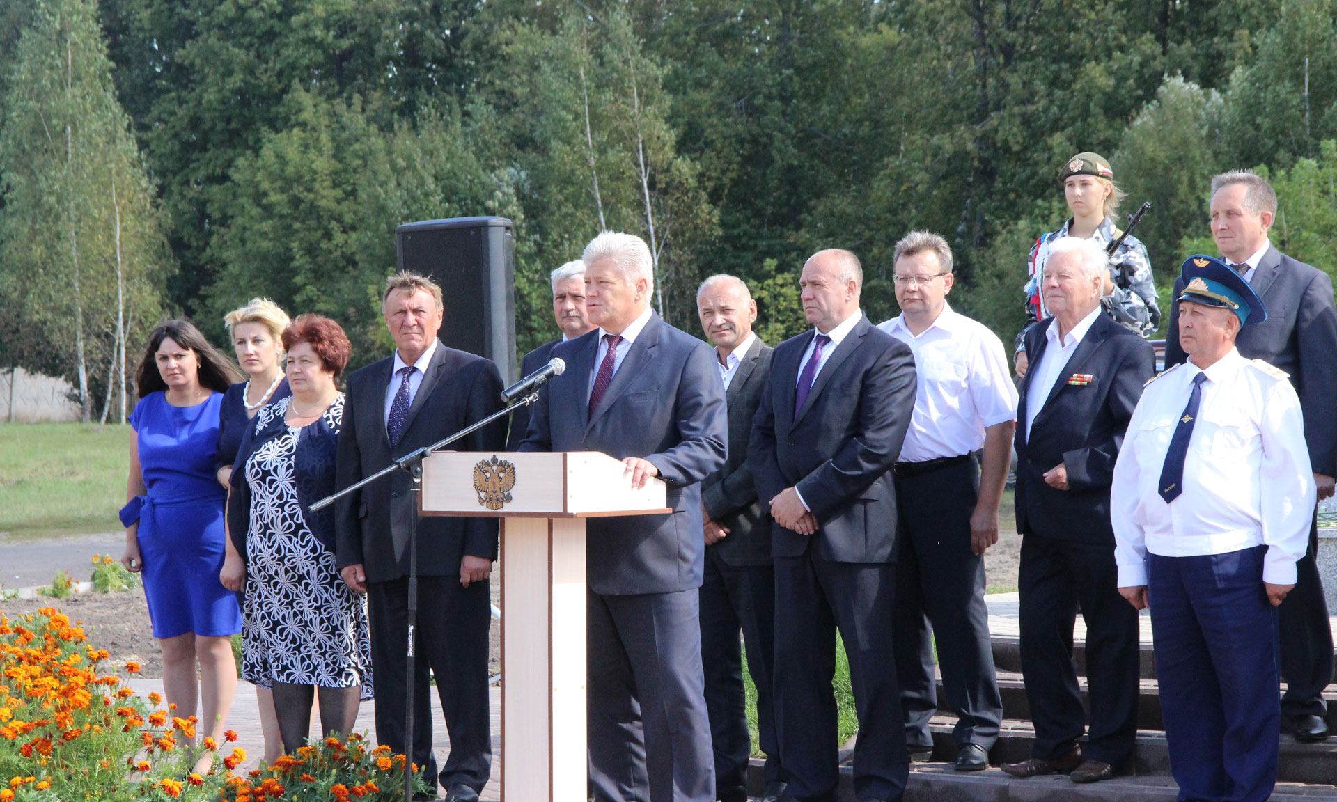 Торжественный митинг начался с возложения цветов к памятнику «Братская могила 26 советских воинов, погибших при защите села». От имени Губернатора Александра Богомаза к жителям п. Кокоревка обратился Александр Жигунов: