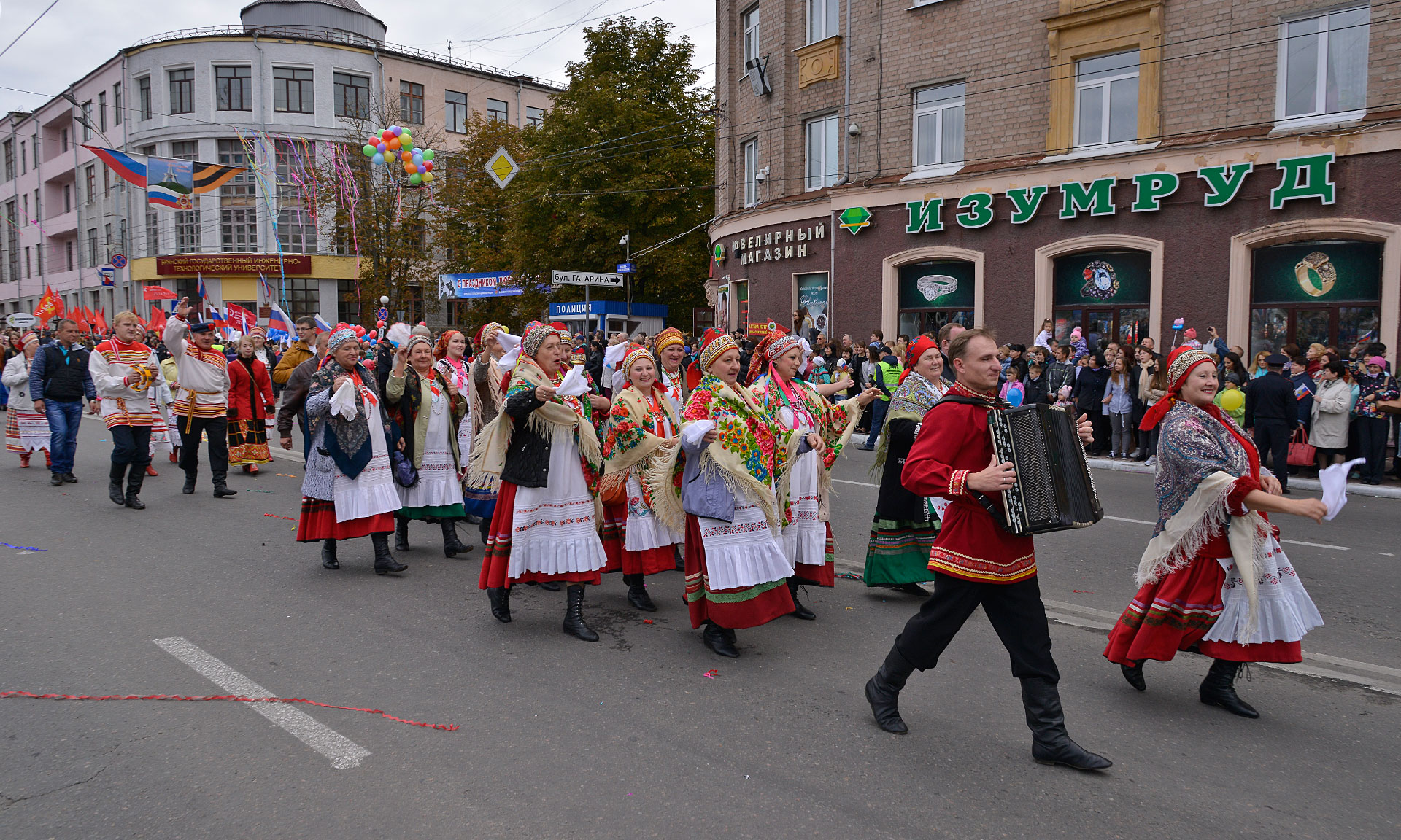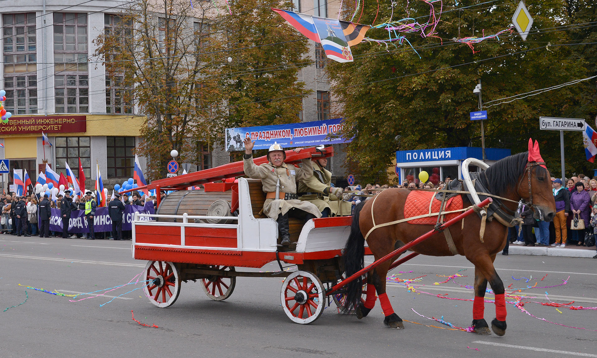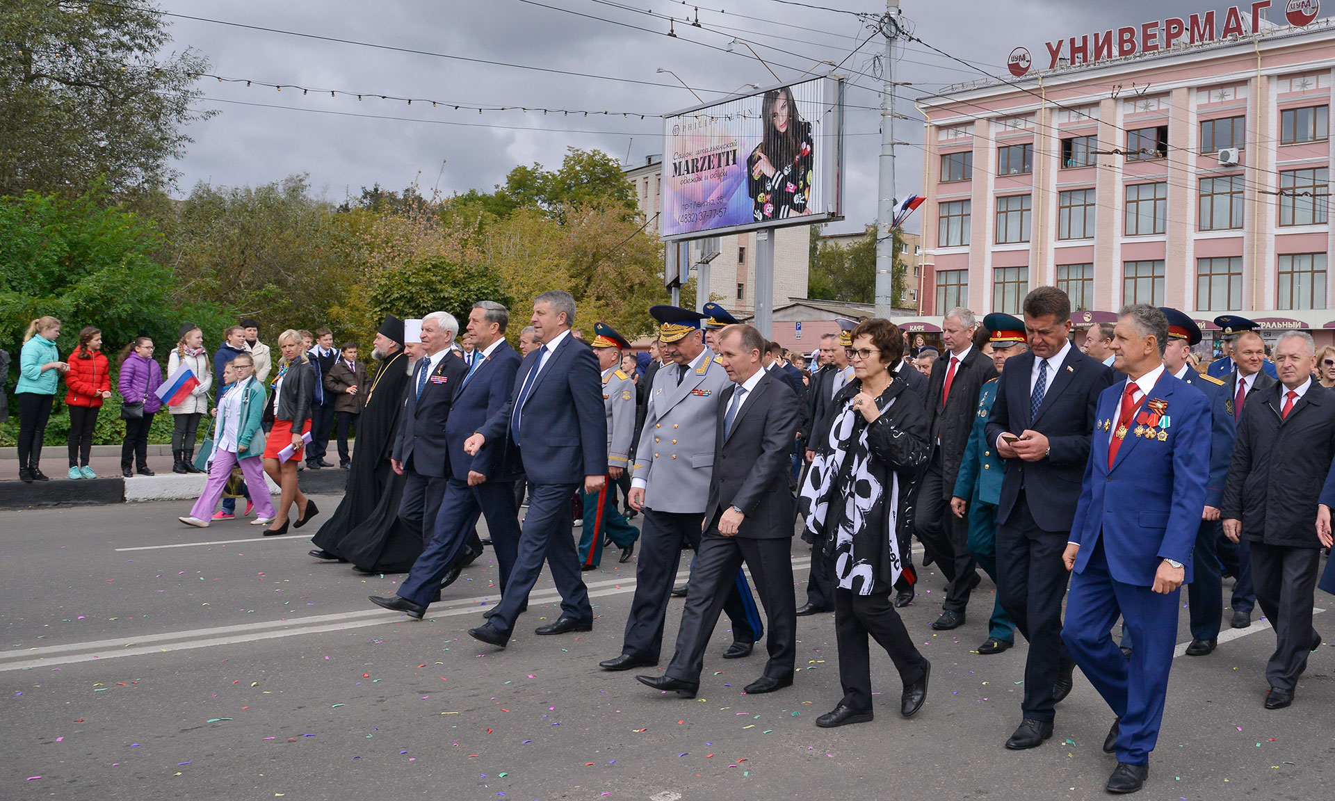 В праздничном строю — представители предприятий и организаций, творческих коллективов, юнармейцы, жители и гости города, делегации Республики Беларусь, Республики Сербия, Республики Польша, Латвийской республики, Литовской республики, автономного территориального образования «Гагаузия» Республики Молдова, делегации городов Орла и Тулы.