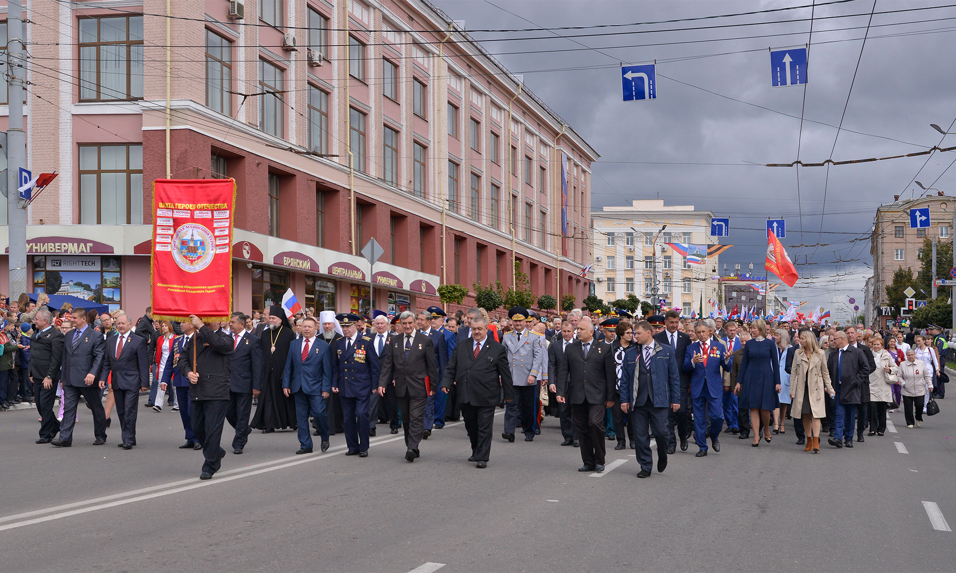 Возглавляют торжественную колонну ветераны на автомобилях УАЗ. В праздничном шествии — Герои России, Советского Союза и Социалистического труда, личный состав воинских частей и подразделений Брянского гарнизона, силовых ведомств, представители территориальных органов государственной власти Брянской области. Несколько поколений соединились в один строй — поколение победителей, поколение Героев Отечества и молодое поколение: школьники и студенты, которые с гордостью приветствуют и равняются на этих людей!