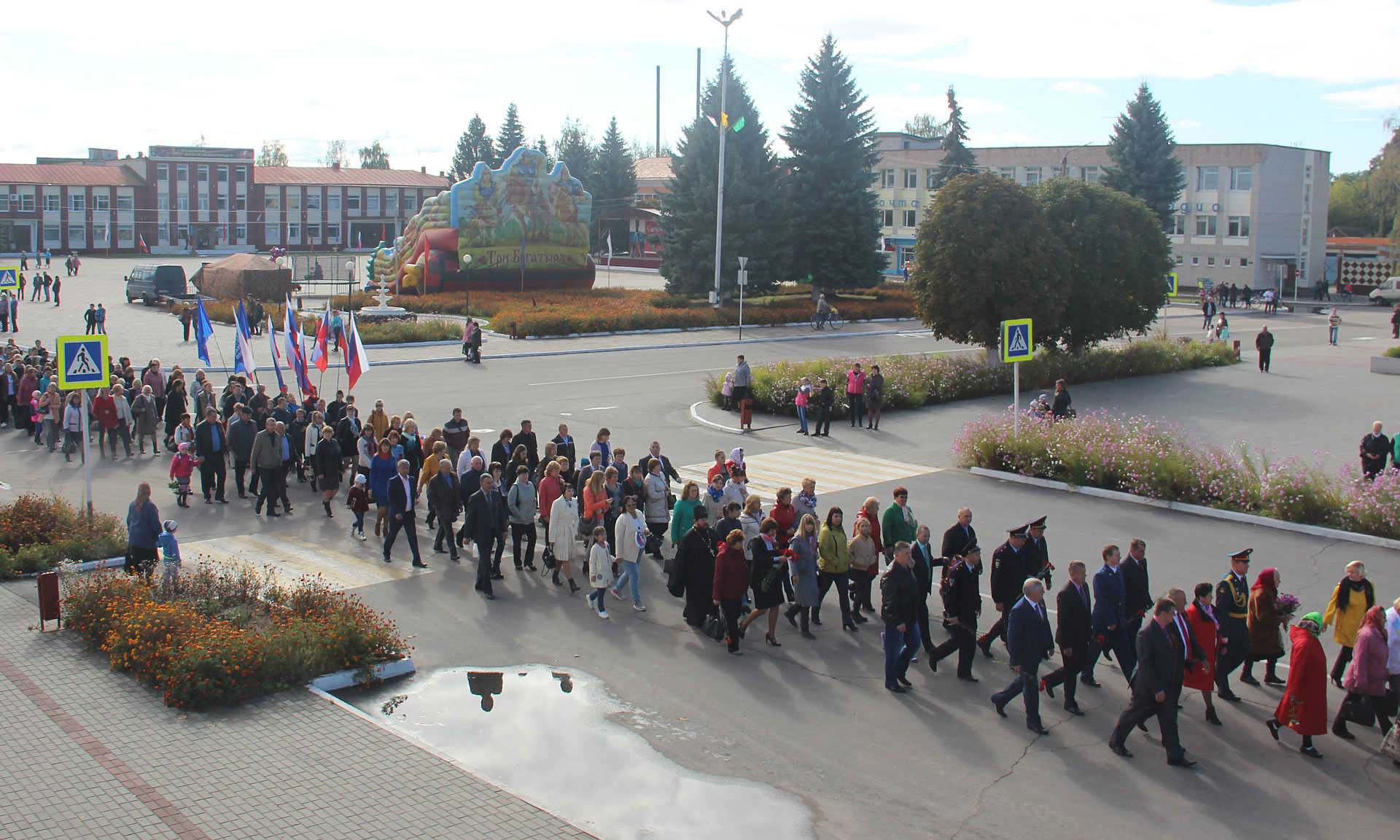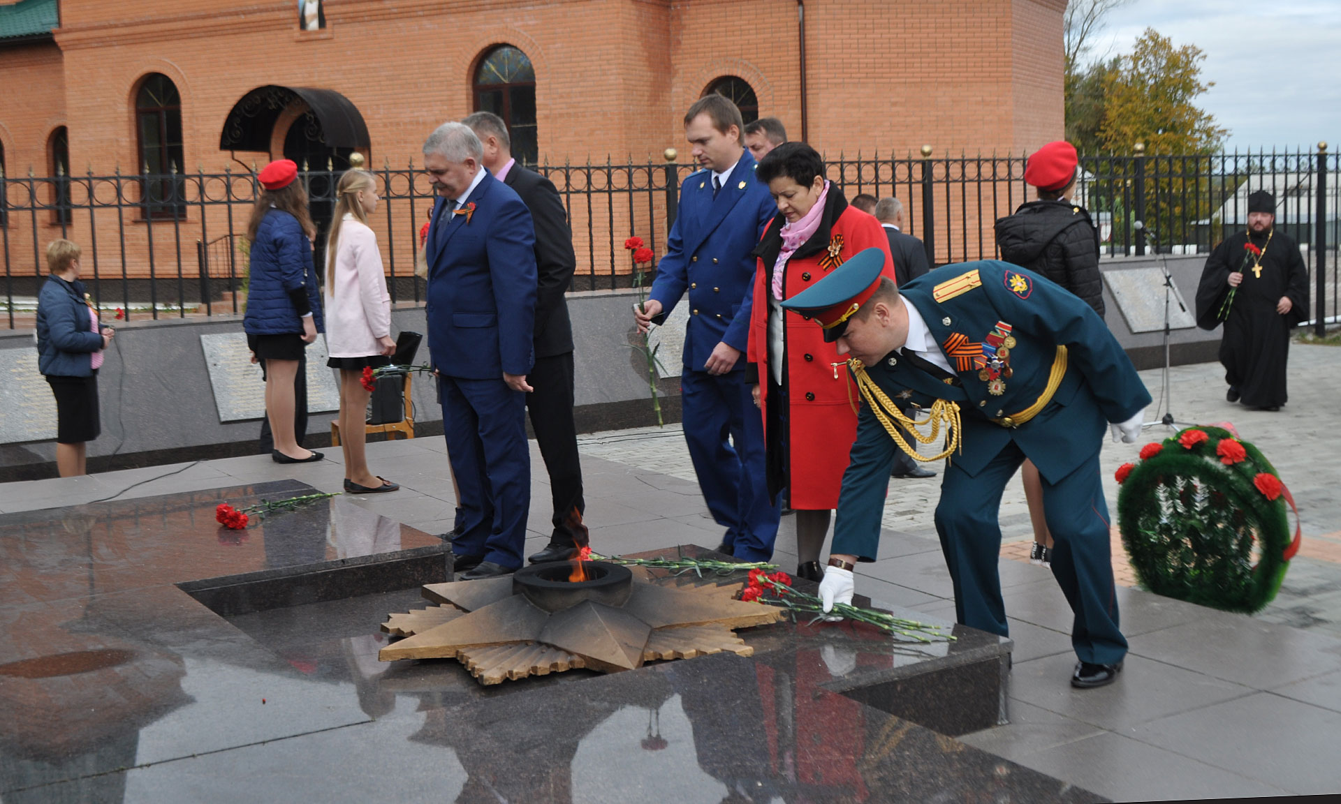 Памятное мероприятие, посвященное 73-й годовщине освобождения поселка и района, традиционно началось на историческом и святом для всех жителей райцентра месте — в сквере Славы у монумента Мужества и возле возведенного храма Во имя Святой Троицы, открытого ровно год назад.