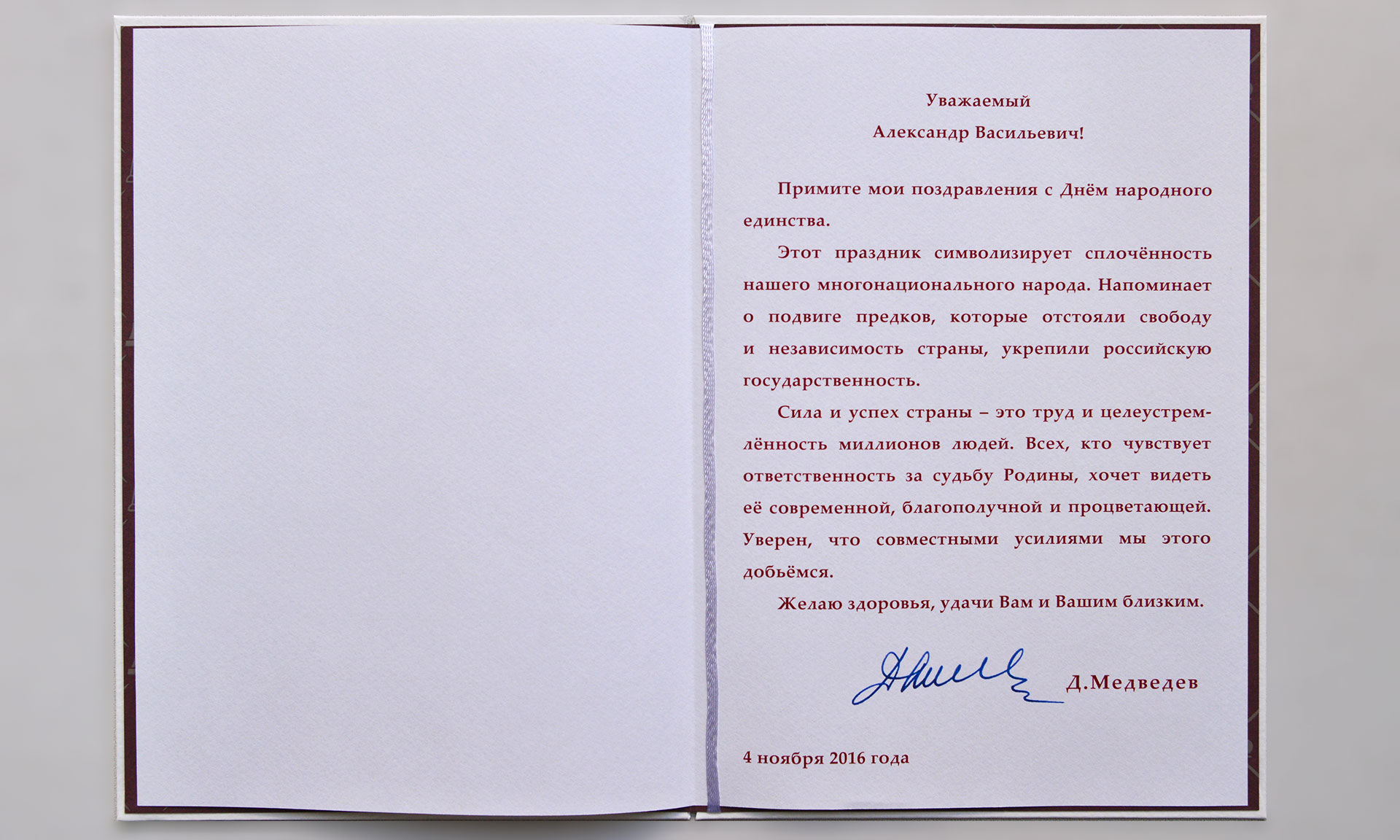 В адрес Губернатора Брянской области Александра Богомаза поступило поздравление с Днем народного единства от Председателя Правительства РФ Дмитрия Медведева. В поздравлении, в частности, говорится: