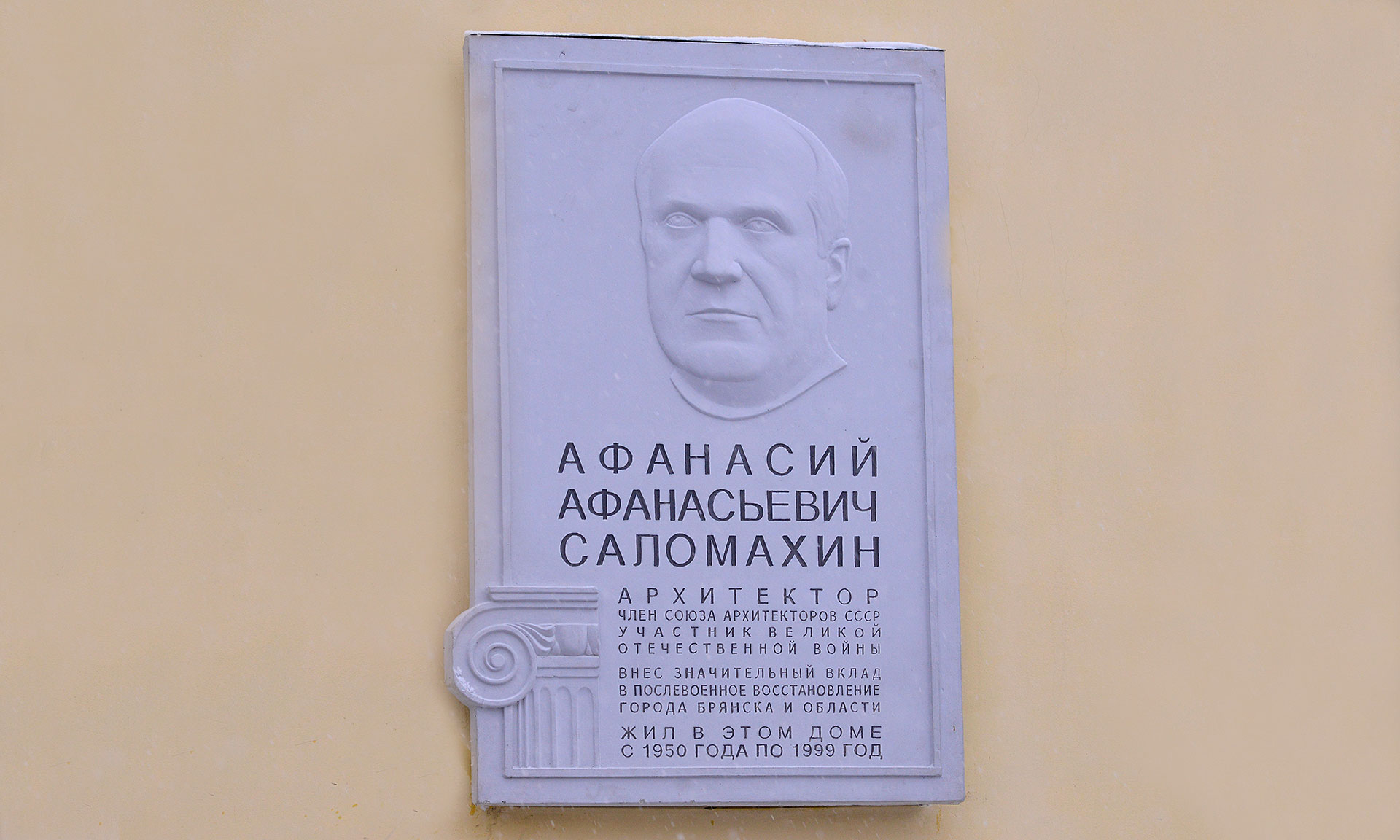 В славной плеяде зодчих Брянска имя Афанасия Афанасьевича Саломахина, члена Союза архитекторов СССР, ассоциируется прежде всего с объектами, построенными в 50-е годы прошлого века и являющими собой лучшие образцы архитектурного стиля, получившего название — «советский классицизм».
