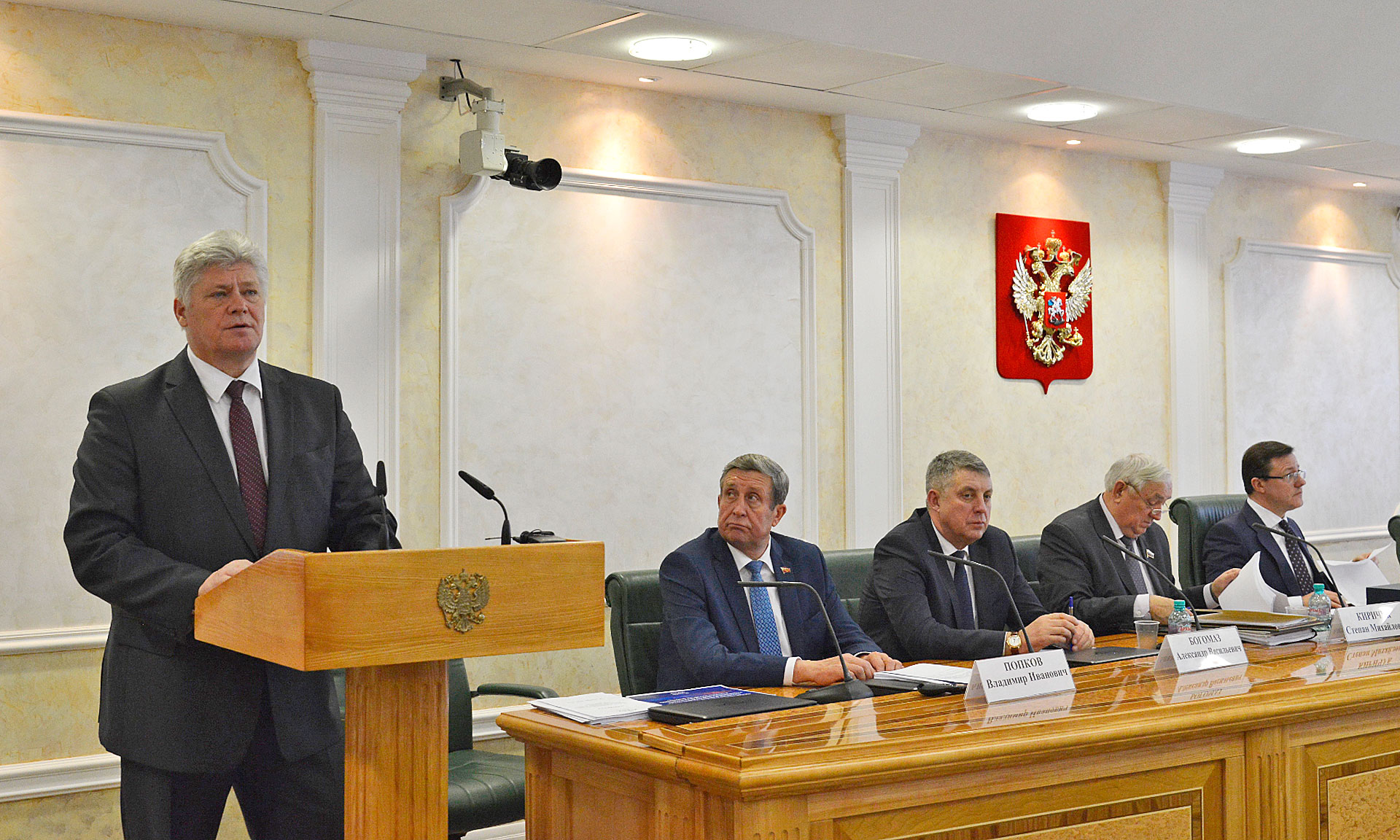 Губернатор Александр Богомаз в начале заседания поблагодарил представителей верхней палаты парламента за возможность участия в заседаниях комитетов членов Правительства Брянской области, рассказать и о достижениях региона, и о тех проблемах, которые сегодня есть, и возможных путях их совместного решения. Глава региона вручил Дмитрию Азарову благодарственное письмо от имени Правительства и икону Святого благоверного князя Олега Брянского, выполненную мастерами возрожденного Дятьковского хрустального завода.