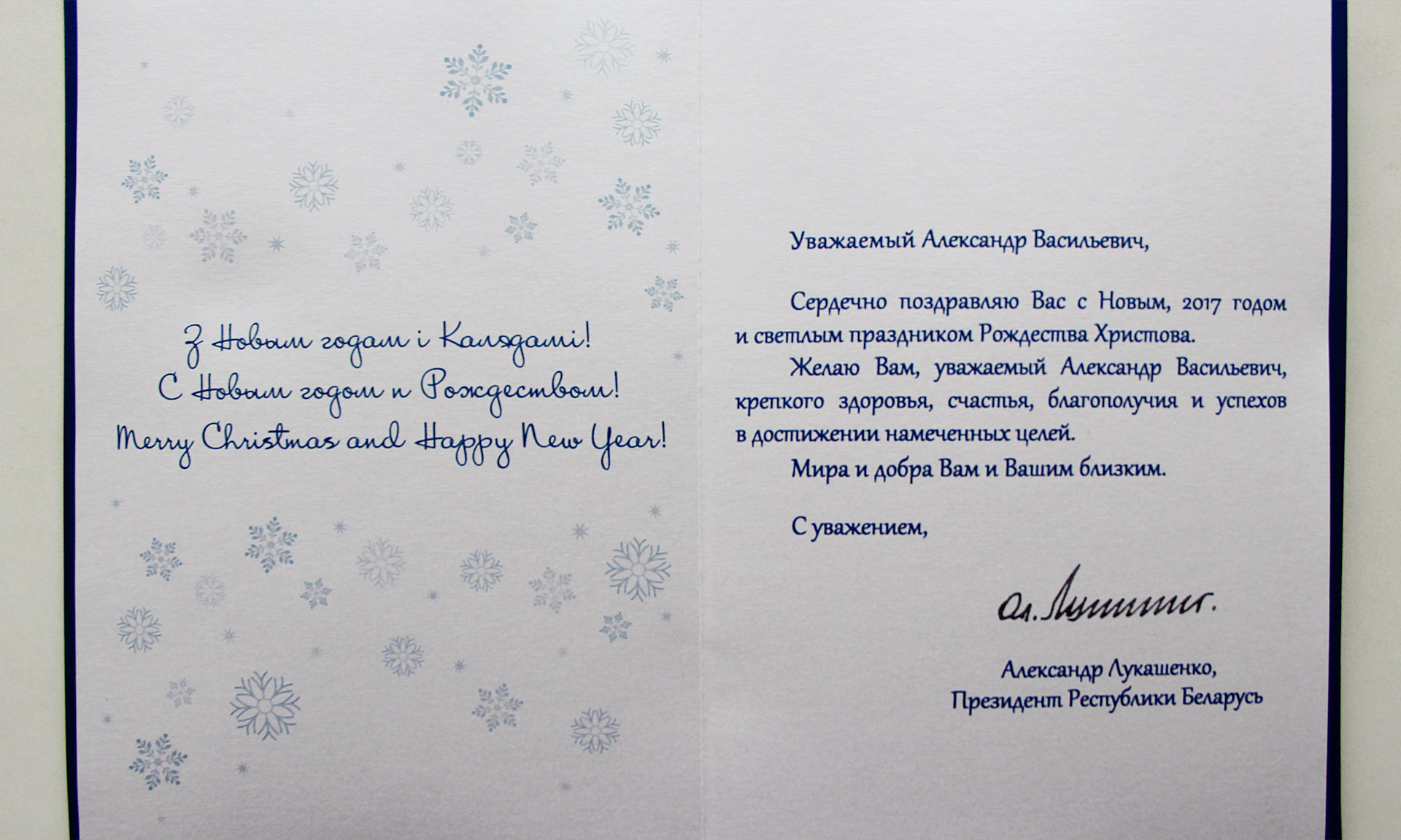 «Уважаемый Александр Васильевич! Сердечно поздравляю Вас с Новым, 2017 годом и светлым праздником Рождества Христова. Желаю Вам, уважаемый Александр Васильевич, крепкого здоровья, счастья, благополучия и успехов в достижении намеченных целей.