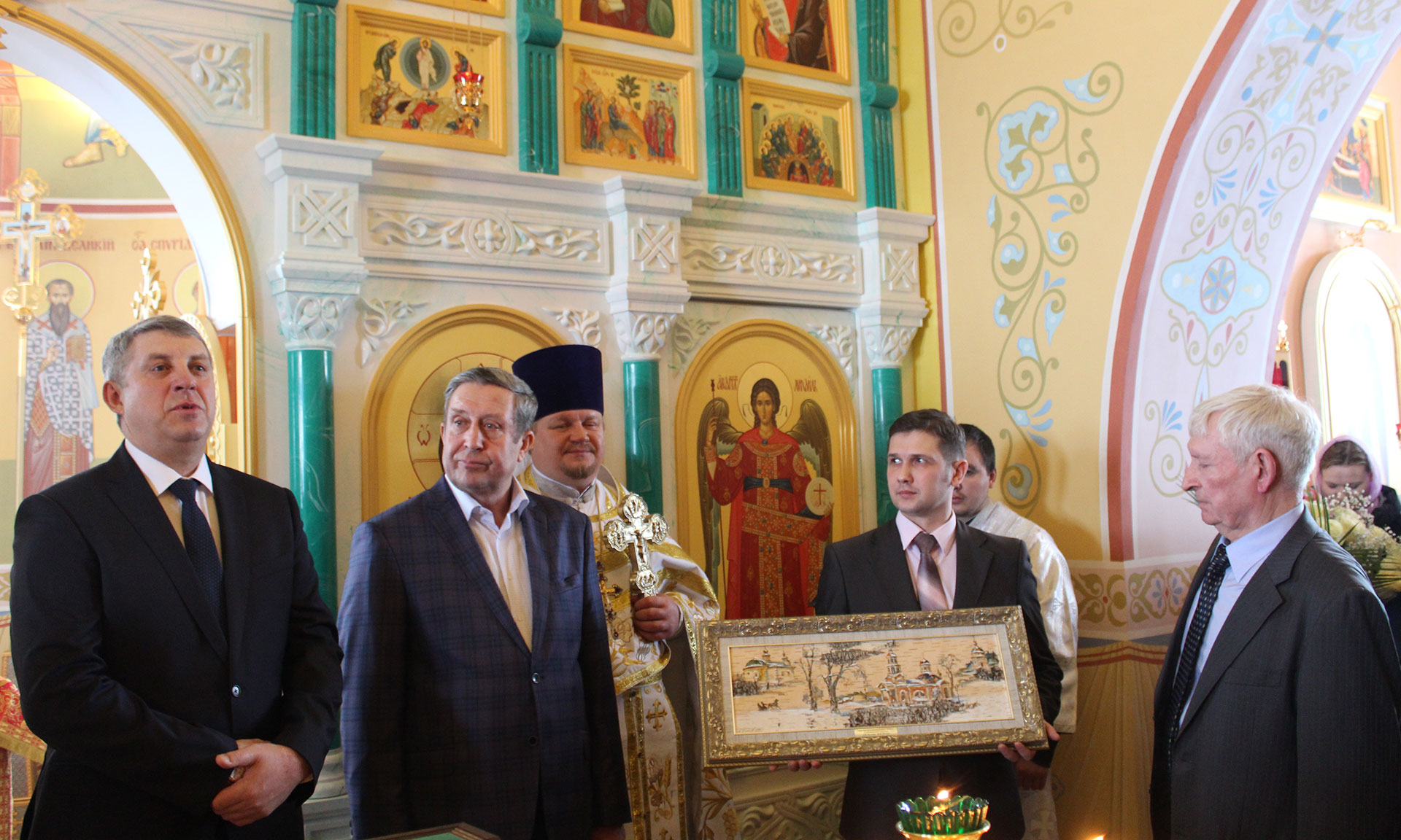 Глава региона высказал слова огромной благодарности Георгию Лобусу и в память о состоявшемся торжестве, а также по случаю дня рождения вручил ему в подарок картину, написанную на бересте известным брянским художником Александром Хомрачёвым, с изображением 3-х восстановленных Георгием Константиновичем святынь.