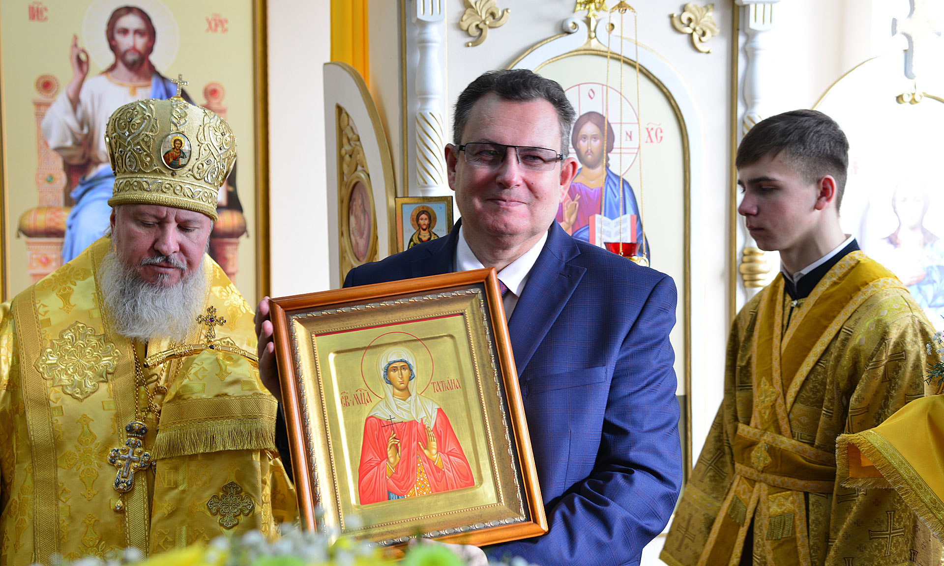 На память о первом богослужении в новом храме Его Высокопреосвященство преподнес Андрею Антюхову образ святой покровительницы студенчества мученицы Татианы. В ответном слове ректор БГУ подчеркнул: