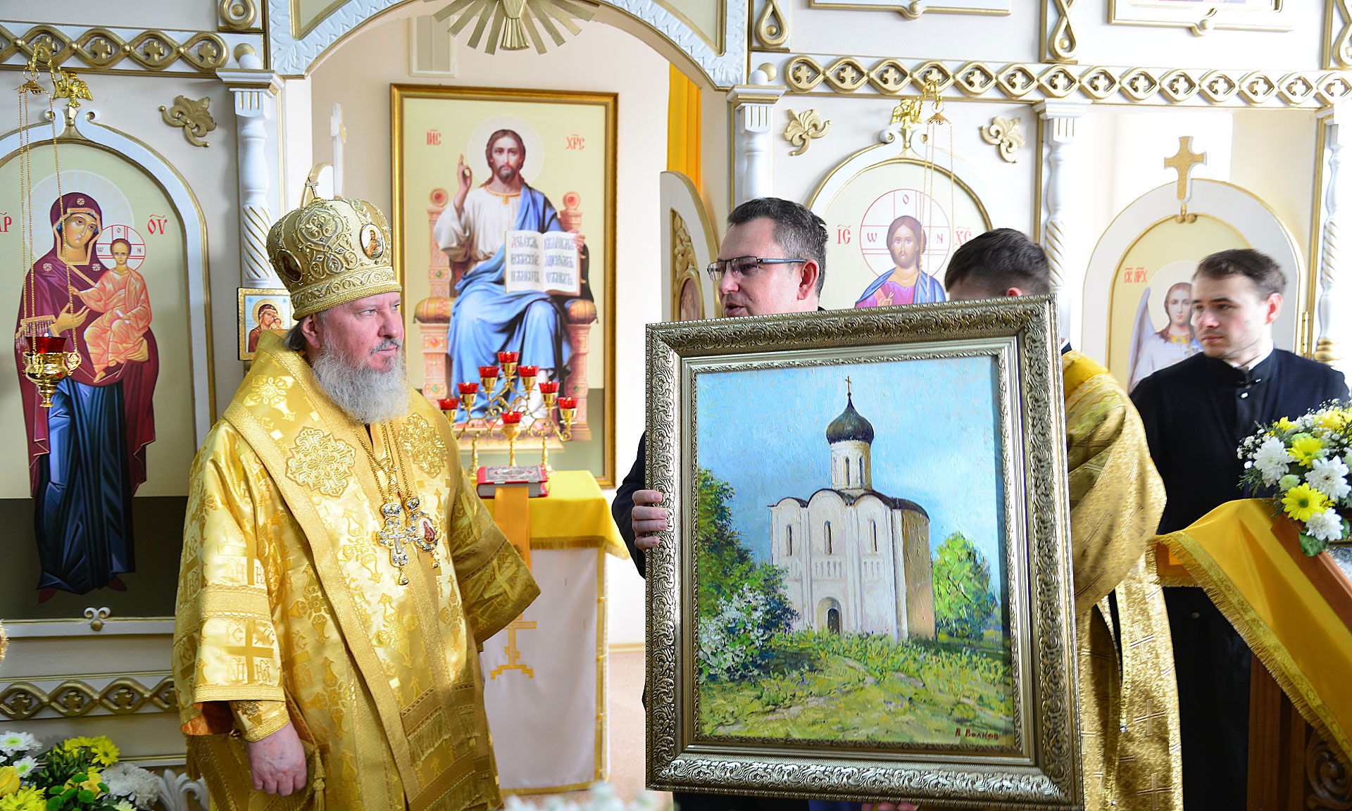 В свою очередь с пожеланиями здоровья и долголетия ректор подарил митрополиту Александру картину кисти заслуженного художника РФ, профессора БГУ Владимира Волкова, также присутствовавшего на богослужении.