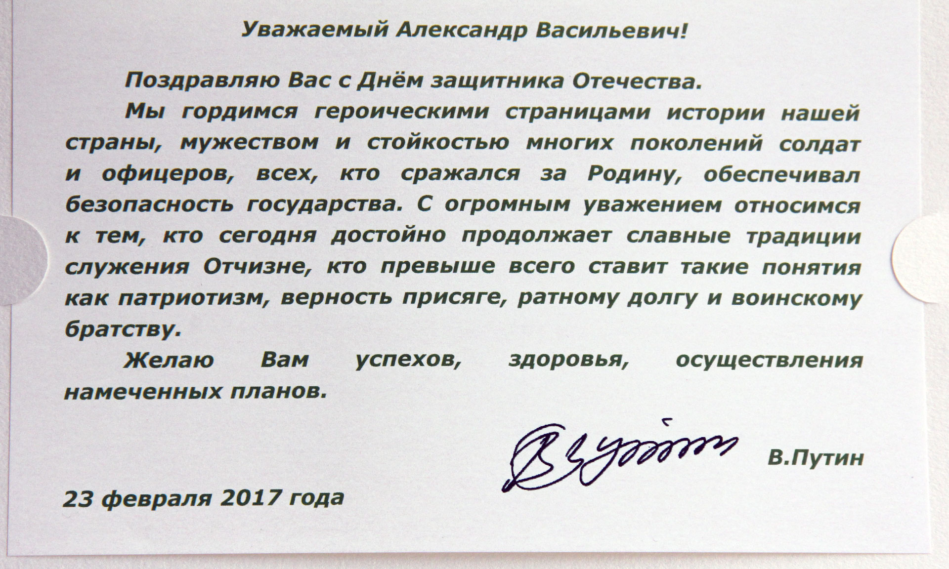 Поздравляю Вас с Днем защитника Отечества. Мы гордимся героическими страницами истории нашей страны, мужеством и стойкостью многих поколений солдат и офицеров, всех, кто сражался за Родину, обеспечивал безопасность государства. С огромным уважением относимся к тем, кто сегодня достойно продолжает славные традиции служения Отчизне, кто превыше всего ставит такие понятия как патриотизм, верность присяге, ратному долгу и воинскому братству.