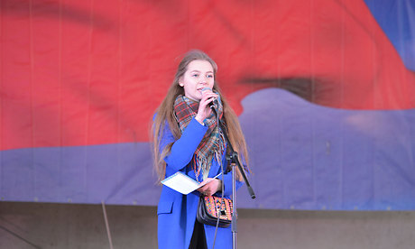 — Дорогие друзья! Хочу поздравить вас со всенародным праздником — днем воссоединения Крыма с Россией! Я родилась и росла в городе-герое Севастополе, где прошли мои школьные годы. В последние три года произошли события, которые изменили жизнь моей семьи, моих друзей, крымчан. В результате референдума Крым стал частью России. Первый раз в жизни я видела, чтобы люди шли на референдум как на праздник — нарядные, с шарами и цветами. До открытия участков выстраивались очереди, в ночь подсчета голосов город не спал. Подавляющее большинство жителей нашего города проголосовали «за», и наконец-то восторжествовала справедливость! Крым и Севастополь вернулись в родную гавань! 18 марта из всех окон виднелись российские триколоры, гремели салюты, люди плакали от счастья. 1 апреля 2014 года я получила паспорт гражданина Российской Федерации. В 2016 году исполнилась моя мечта — я поступила в один из из лучших вузов России — Брянский государственный университет.
