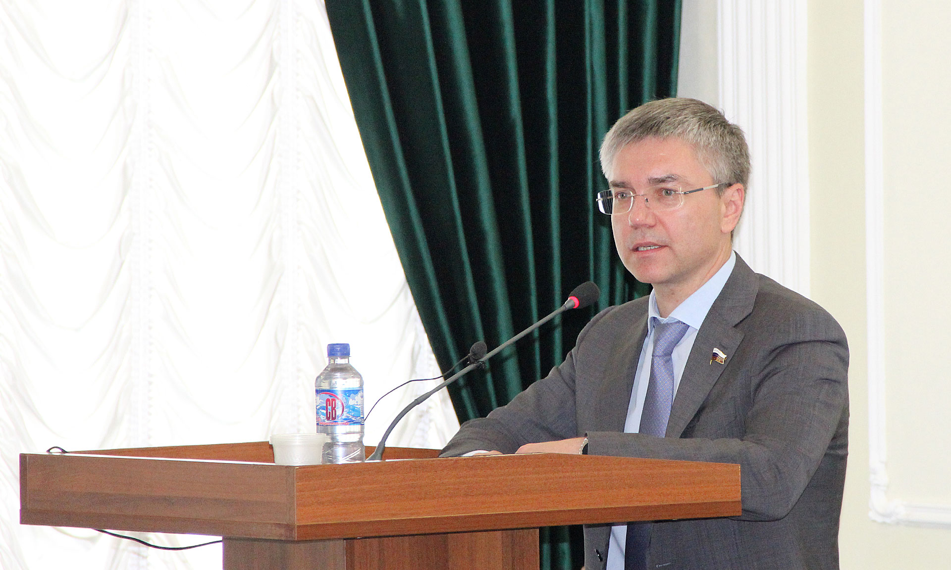 — Очень рад быть на Брянской земле, тем более что это мой первый приезд к вам в область. Позвольте приветствовать вас от лица Союза журналистов России, пожалуй, самой массовой творческой организации в нашей стране.