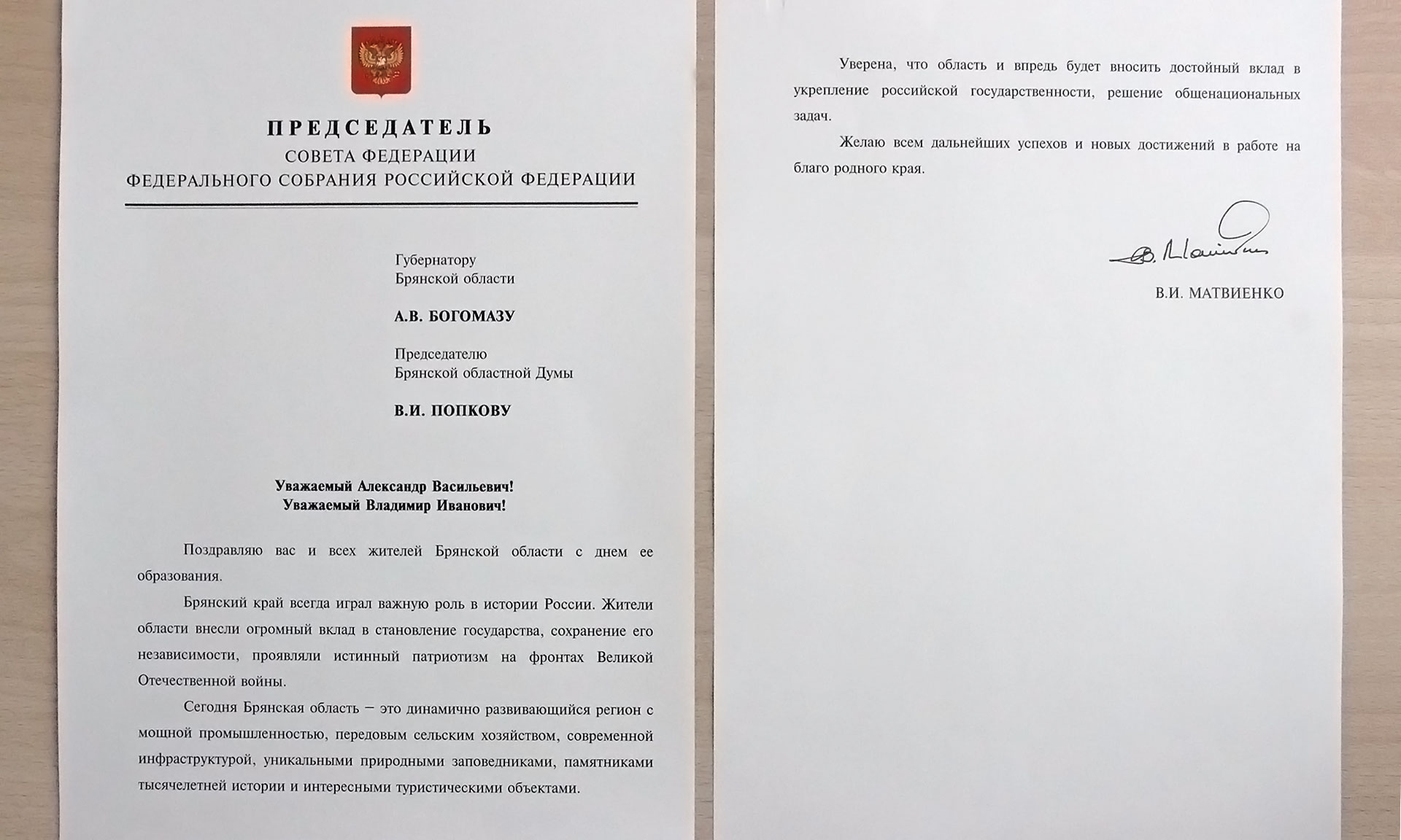 Председатель Совета Федерации Федерального Собрания Российской Федерации Валентина Матвиенко поздравила жителей и руководителей Брянской области с Днем образования Брянской области.