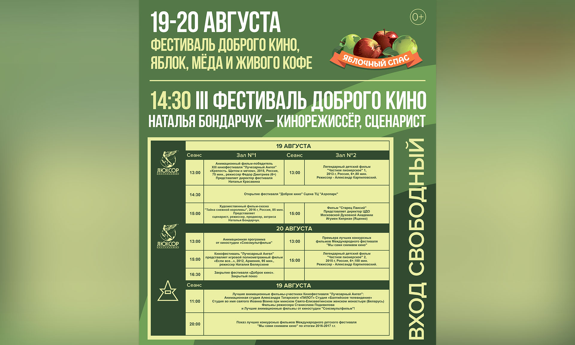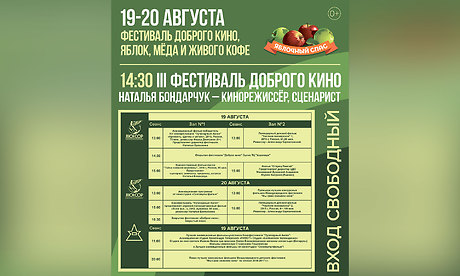 Праздник доброго кино в Брянске проходит в третий раз и является центральным событием областного фестиваля «Яблочный Спас». По традиции гостей фестиваля принимают лучшие кинозалы города. Партнеры фестиваля — ТЦ «Аэропарк» и сеть кинотеатров «Люксор» — покажут лучшие фестивальные фильмы для детей и взрослых совершенно бесплатно.