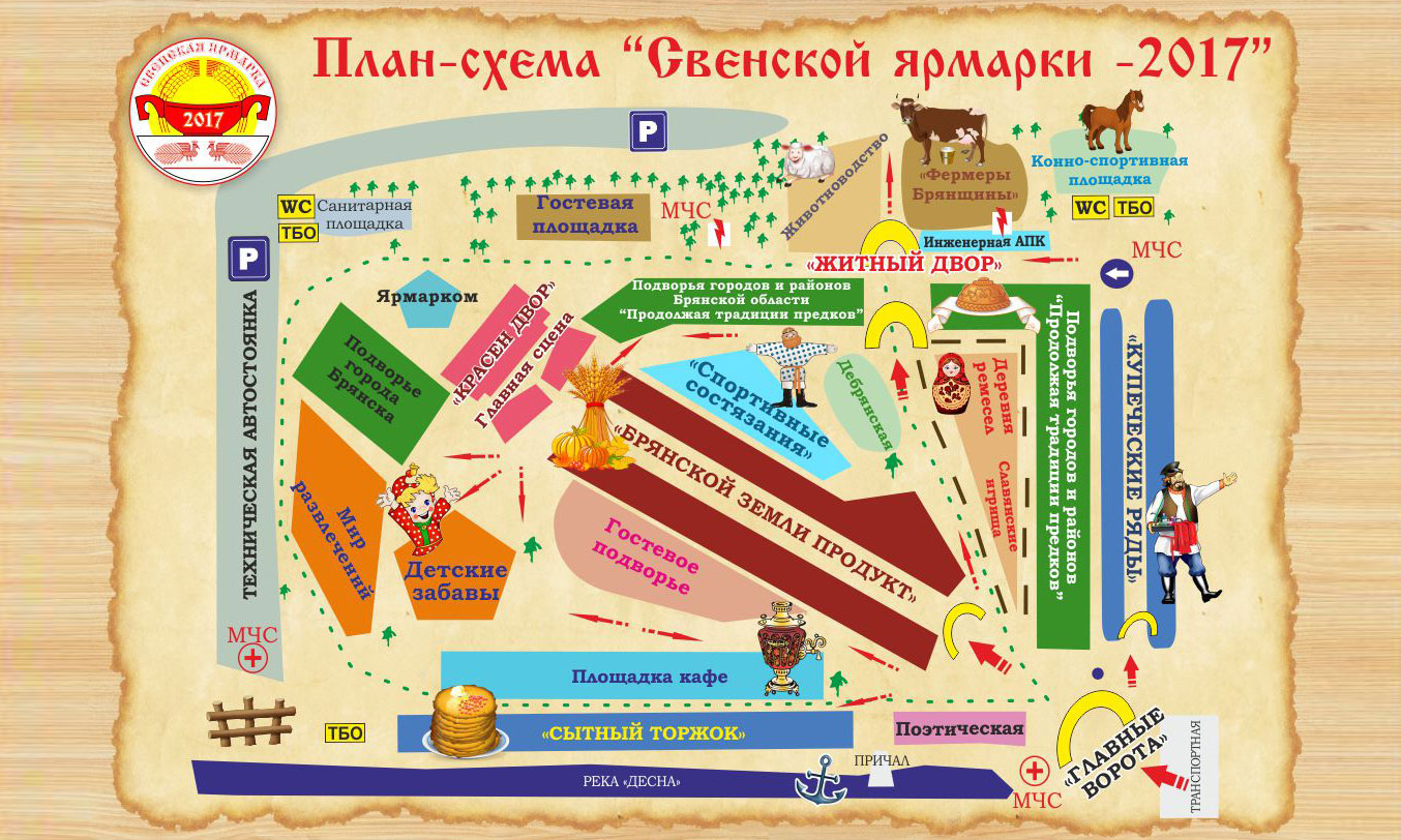 Яркая, насыщенная программа Свенской ярмарки — 2017 развернется на различных презентационных, концертных и интерактивных площадках: «Дебрянская», «Житный двор», «Главная сцена — «Красен двор», «Купеческие ряды», «Сытный торжок», «Славянские игрища», «Поэтическая», «Мир развлечений», «Спортивные состязания», «Детские забавы» и многих других.