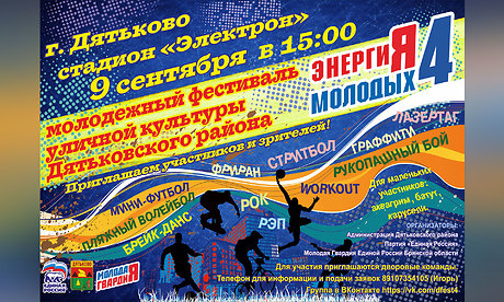 В целях пропаганды здорового образа жизни, развития и поддержки молодежной инициативы, снижения вовлечения подростков в противоправную деятельность Брянское региональное отделение «Молодой Гвардии», администрация Дятьковского района при участии Управления по контролю за оборотом наркотиков УМВД России по Брянской области проведут фестиваль уличной культуры «Энергия молодых-4».