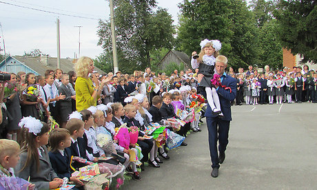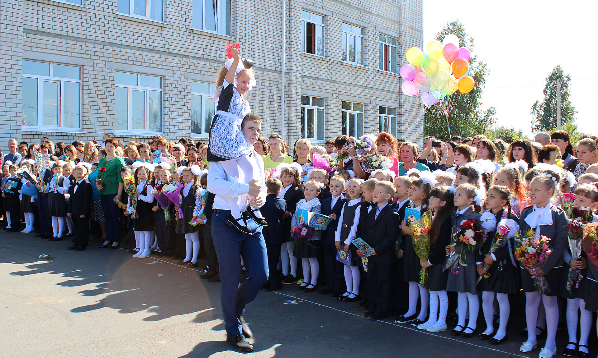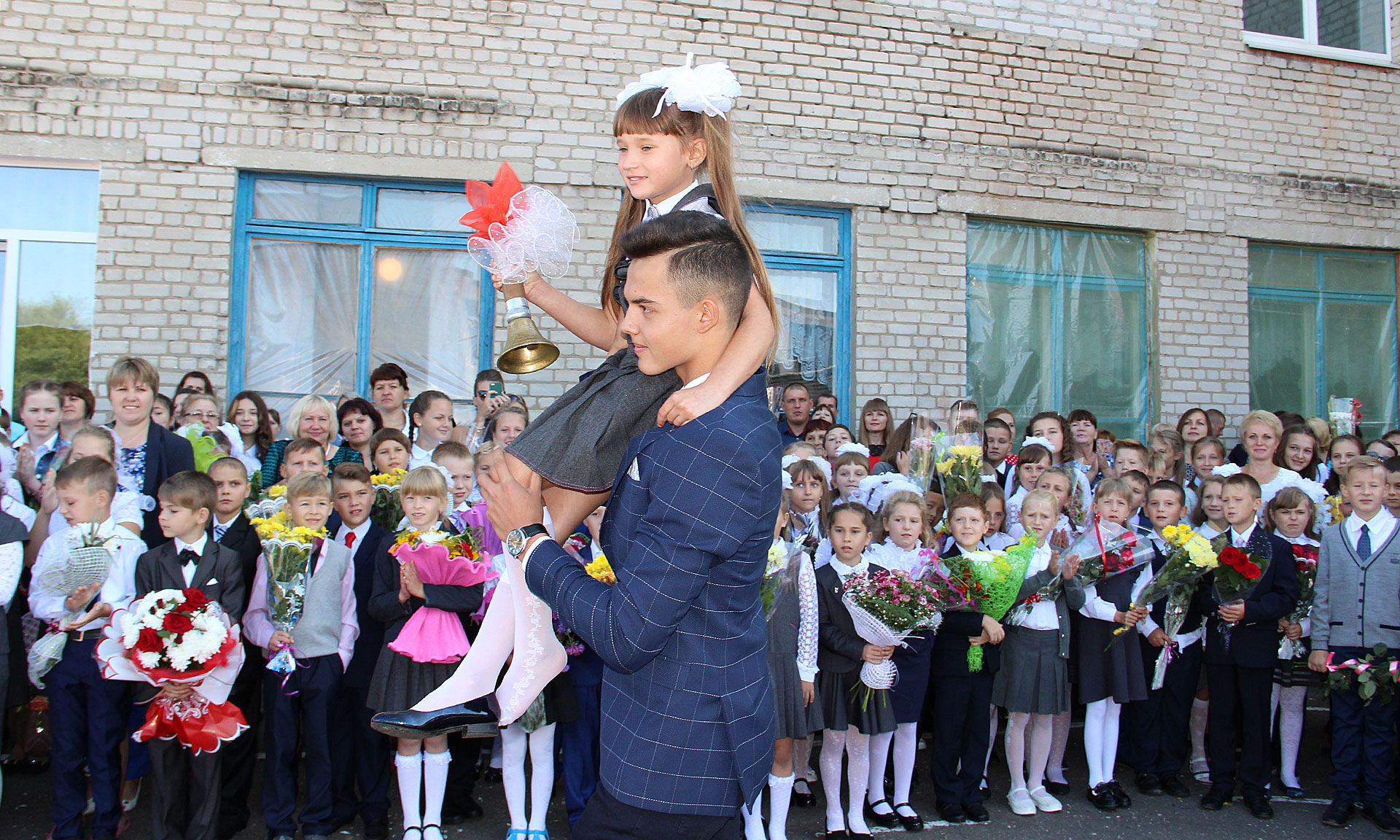 Прозвучал первый звонок, который подала колокольчиком первоклассница, сидя на сильном плече одиннадцатиклассника.