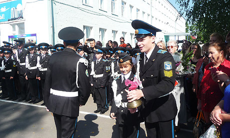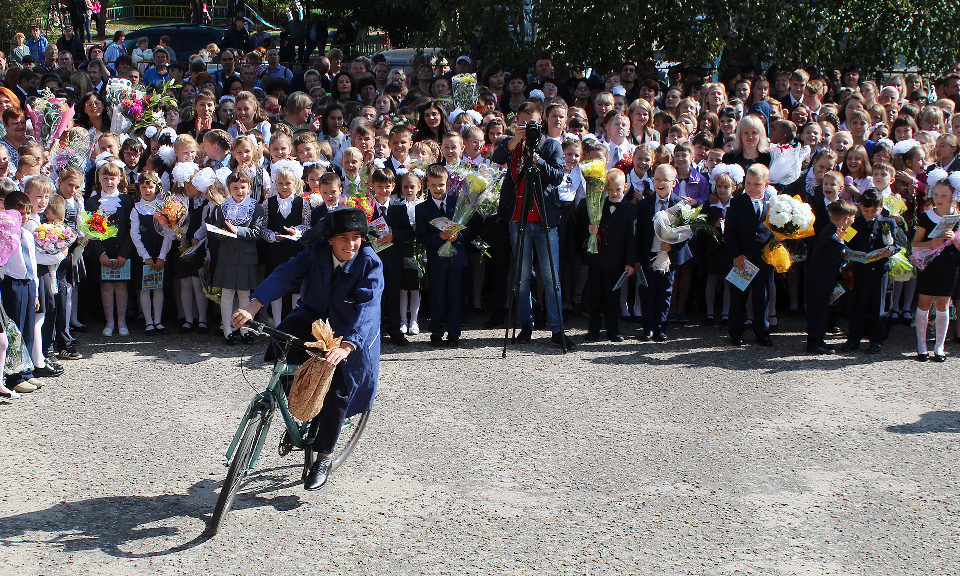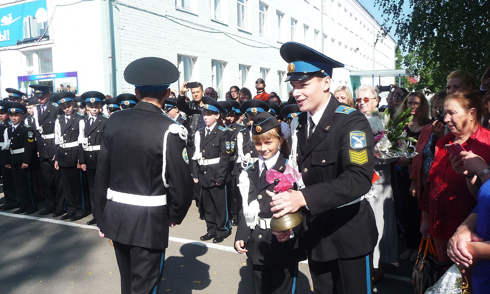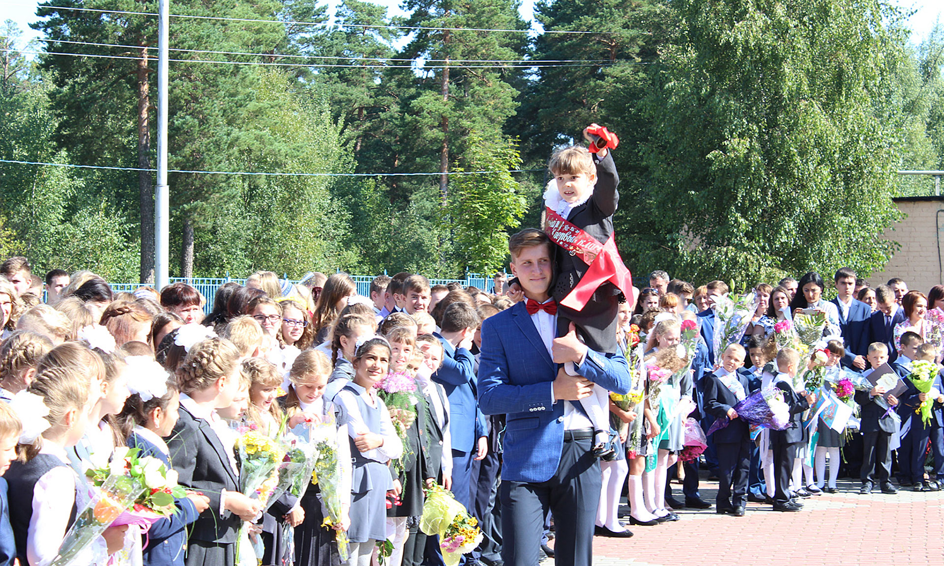Прозвучал первый звонок, который подала колокольчиком первоклассница, сидя на сильном плече одиннадцатиклассника.