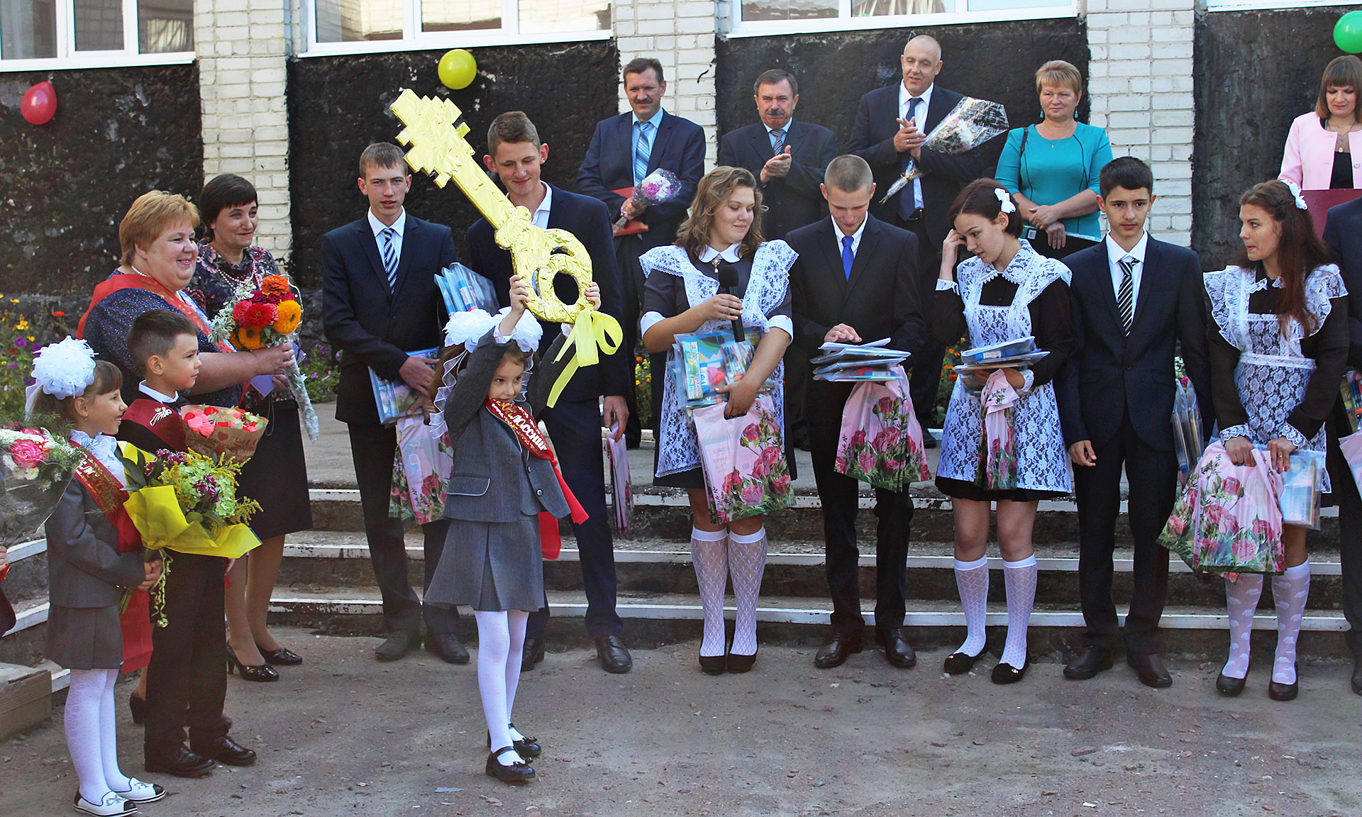 Александр Пущиенко вручил первоклассникам подарки — книги. Королева школьных наук пожелала мальчишкам и девчонкам терпения и трудоспособности. Первоклассникам она передала символический Ключ знаний. В знак благодарности ребята прочитали веселые стихотворения и исполнили песню.