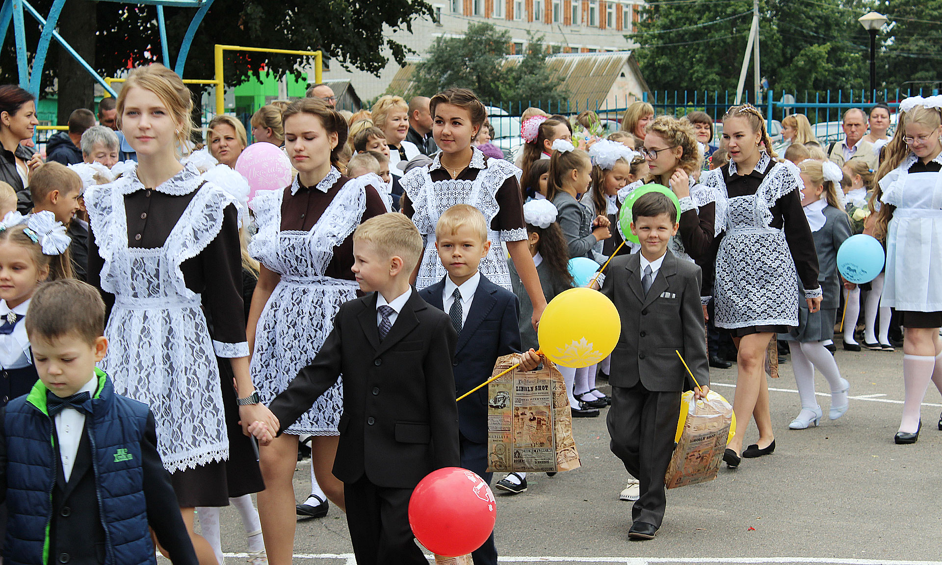 И по традиции ученики выпускных классов повели первоклашек на первый в их жизни урок.