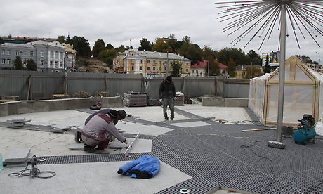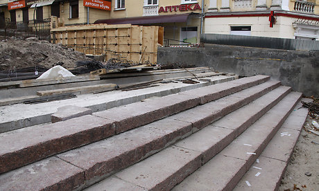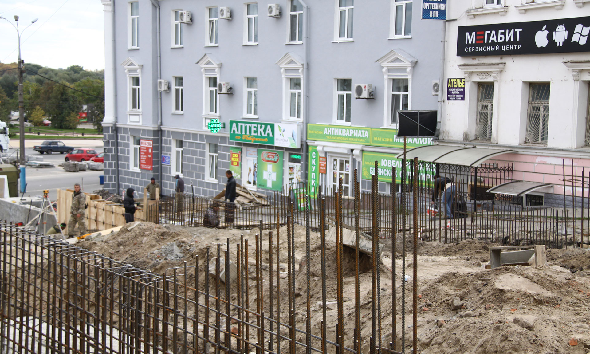В верхней части лестницы ведутся работы по укладке гранитной плитки, к сегодняшнему дню замостили более 600 квадратных метров — это почти половина от общего объема. В центре гранитной площадки обустраивается клумба. В нижней части лестницы ведется армирование и бетонирование подпорных стен.