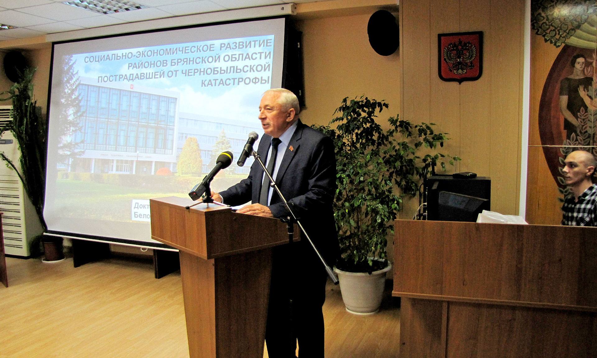 Слово было предоставлено ректору Брянского ГАУ, доктору сельскохозяйственных наук, профессору Николаю Белоусу, выступившему с докладом на тему «Социально-экономическое развитие районов Брянской области пострадавшей от Чернобыльской катастрофы».