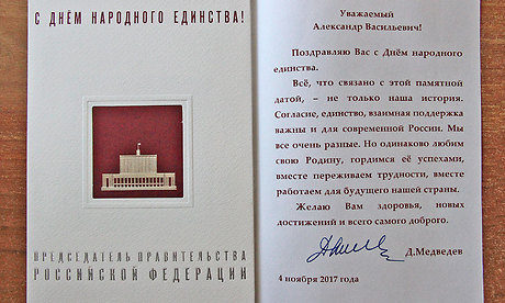 Поздравляю Вас с Днем народного единства. Все, что связано с этой памятной датой, — не только наша история. Согласие, единство, взаимная поддержка важны и для современной России. Мы все очень разные. Но одинаково любим свою Родину, гордимся ее успехами, вместе переживаем трудности, вместе работаем для будущего нашей страны.