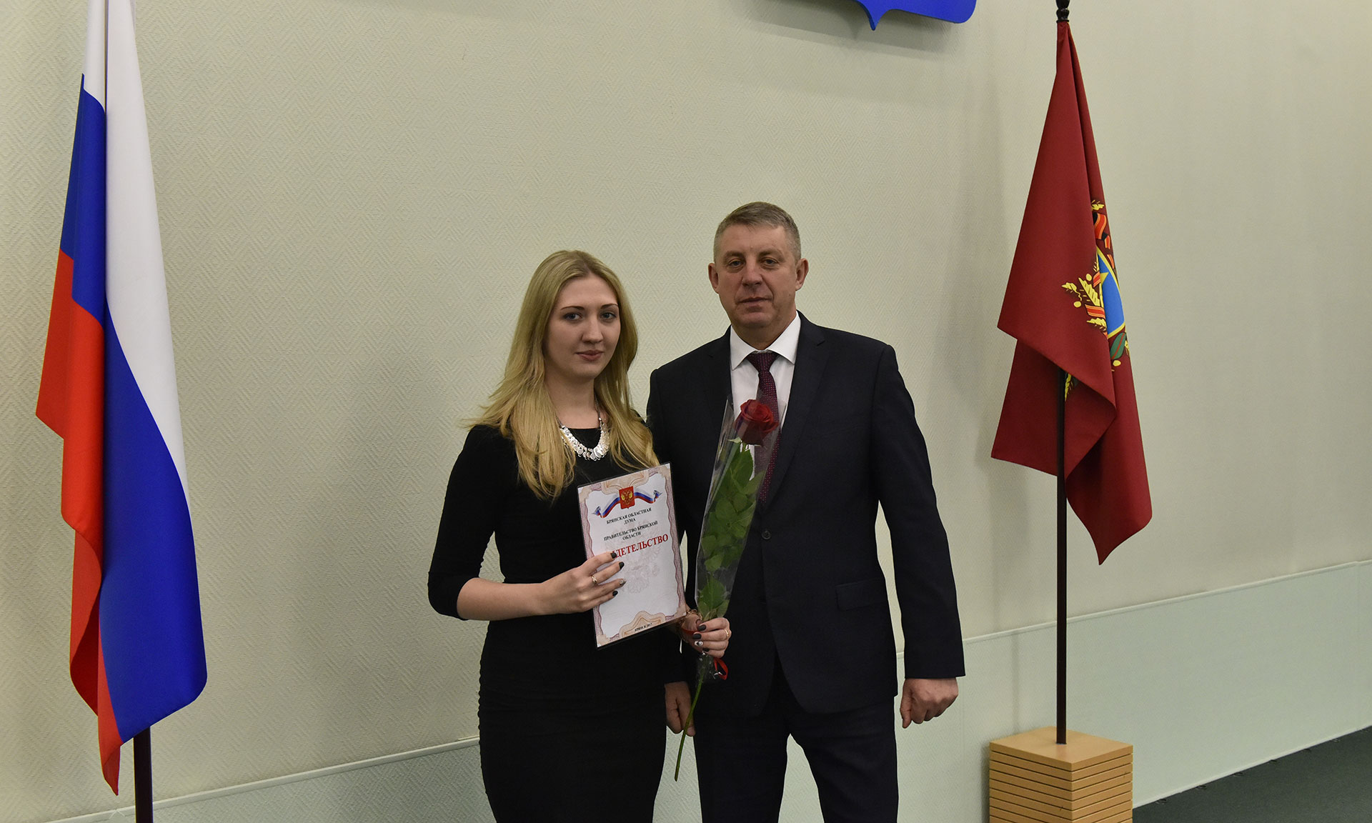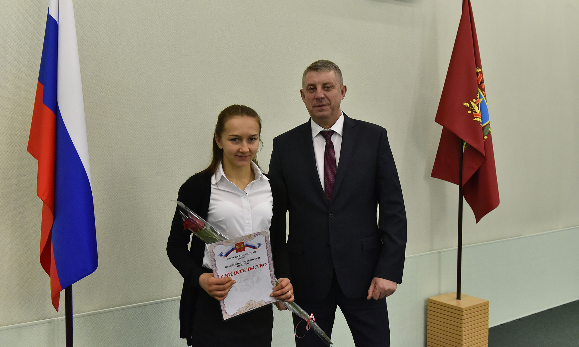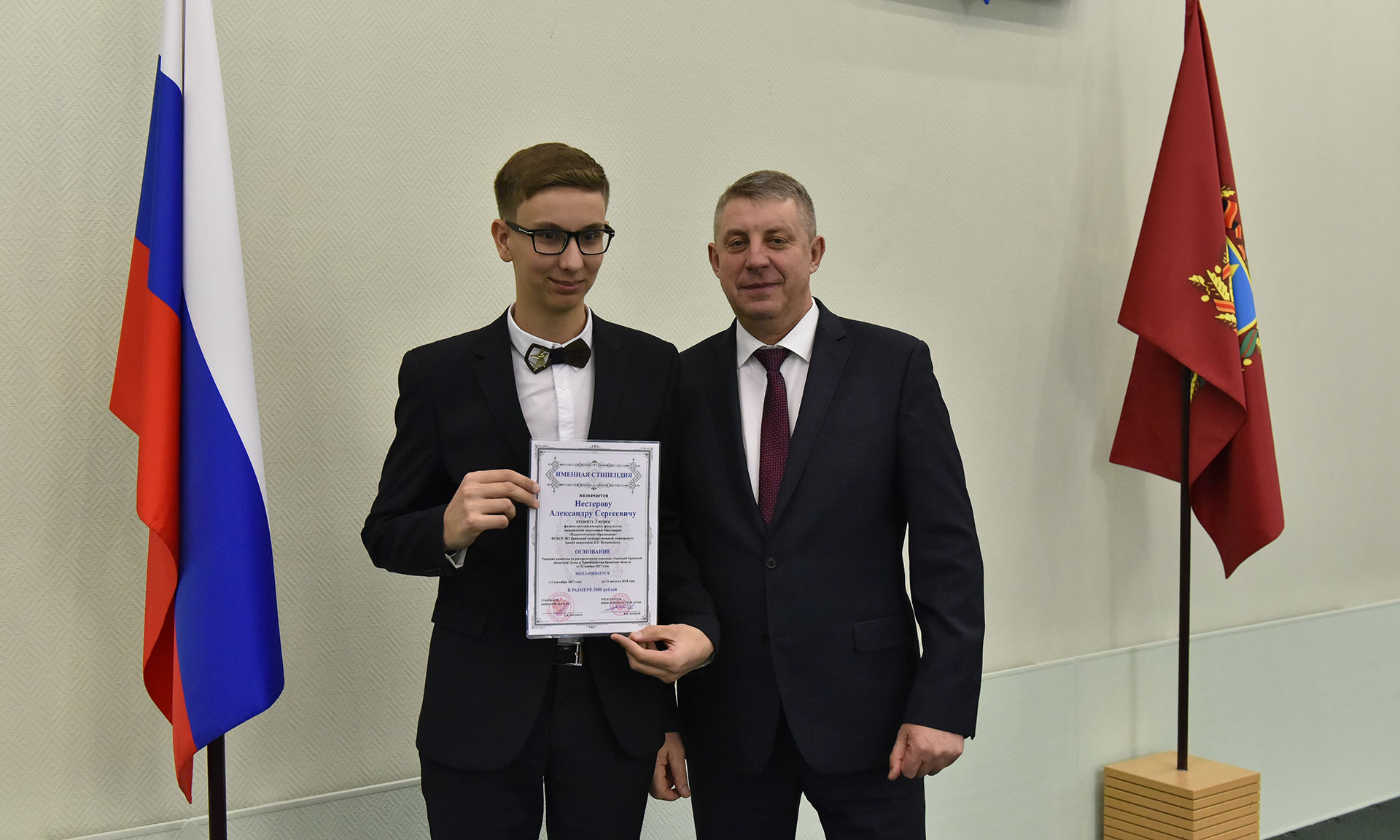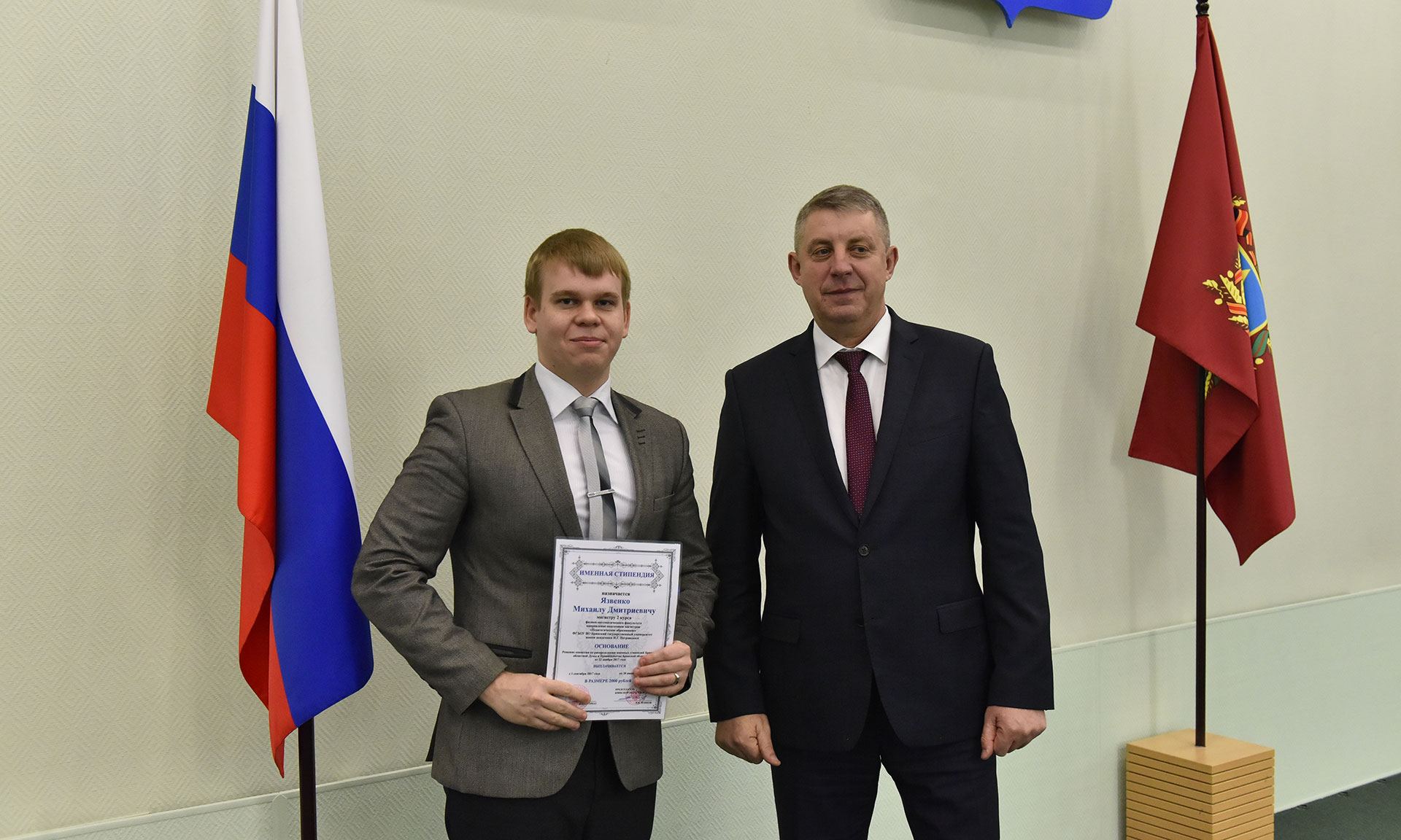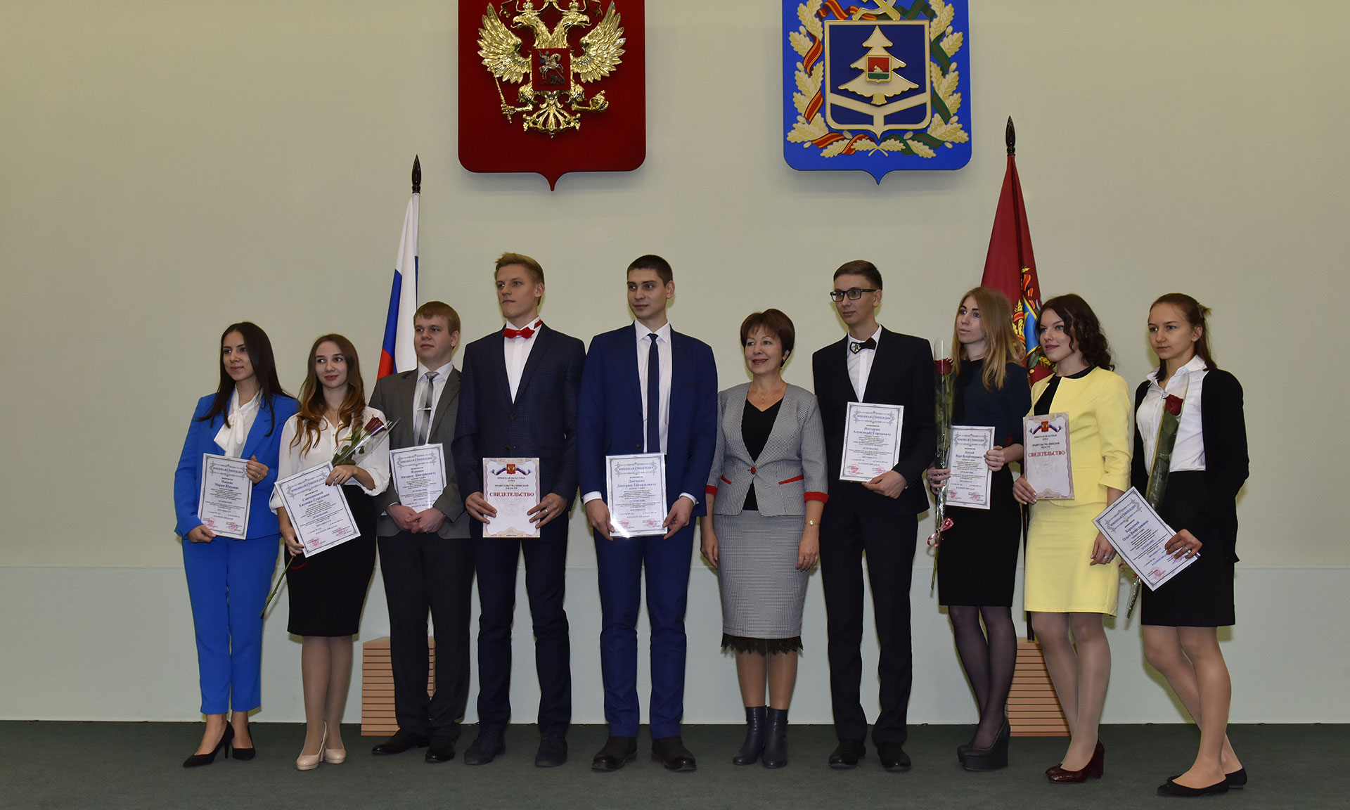 28 ноября в Хрустальном зале Правительства Брянской области состоялась торжественная церемония чествования именных стипендиатов Брянской областной Думы и Правительства Брянской области, а также вручение свидетельств о назначении именных стипендий Правительства Брянской области имени П. Л. Проскурина.